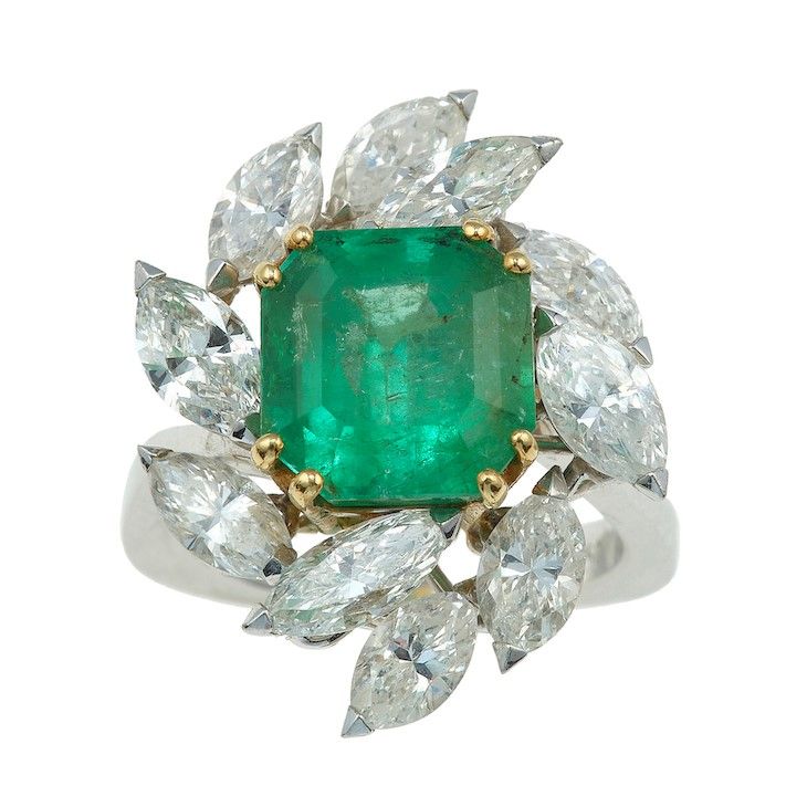 Anello con smeraldo Colombia di ct 4.98 circa e diamanti taglio navette