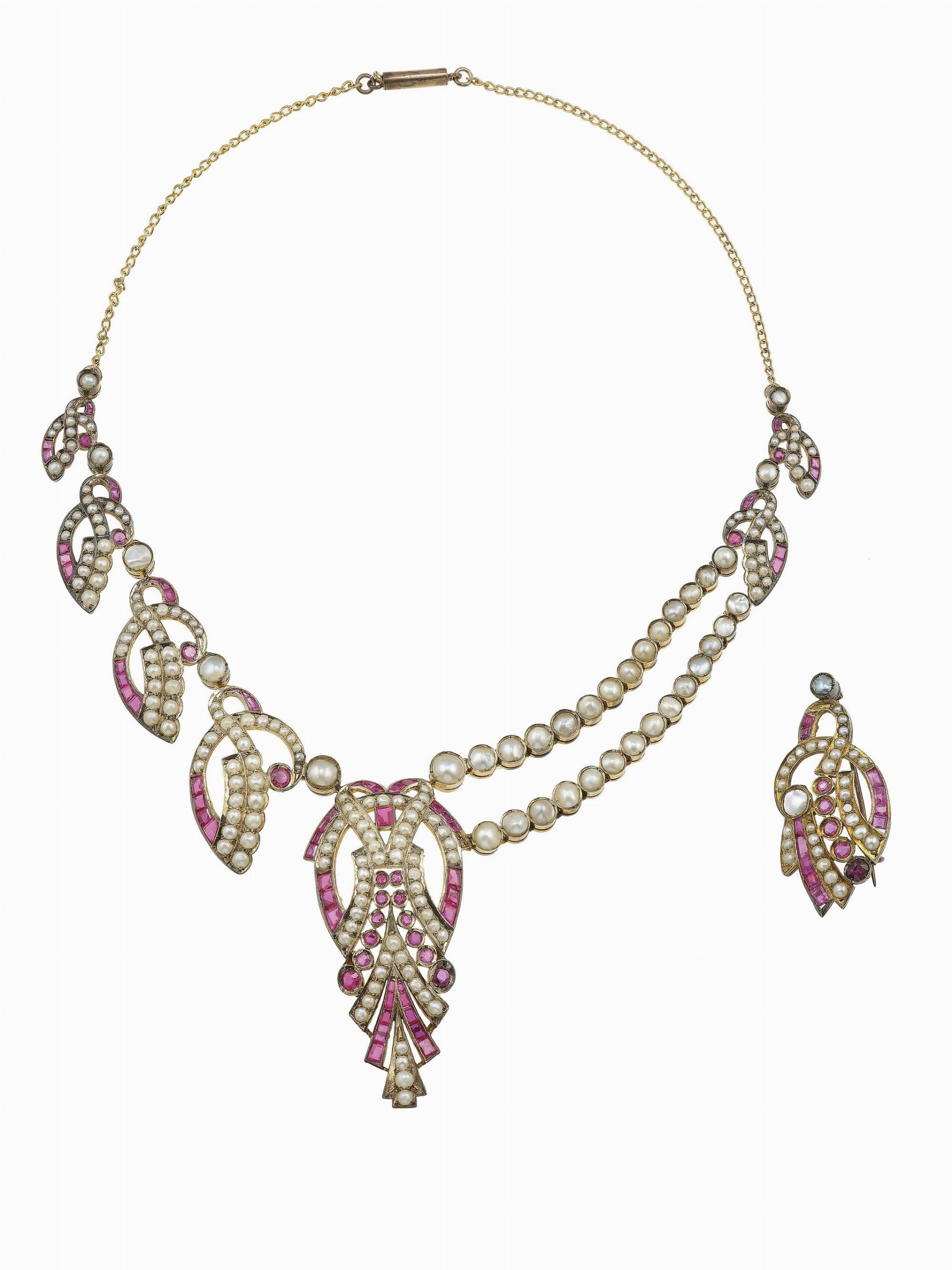 Demi-parure composta da girocollo e spilla con mezze perle e rubini naturali e s [..]