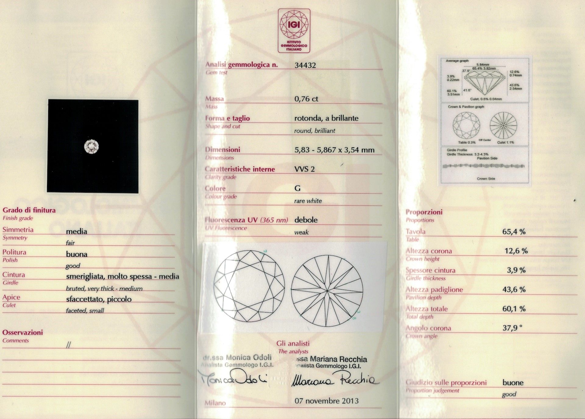 Diamante taglio brillante di ct 0.76, colore G, caratteristiche interne VVS2, fluorescenza [..]