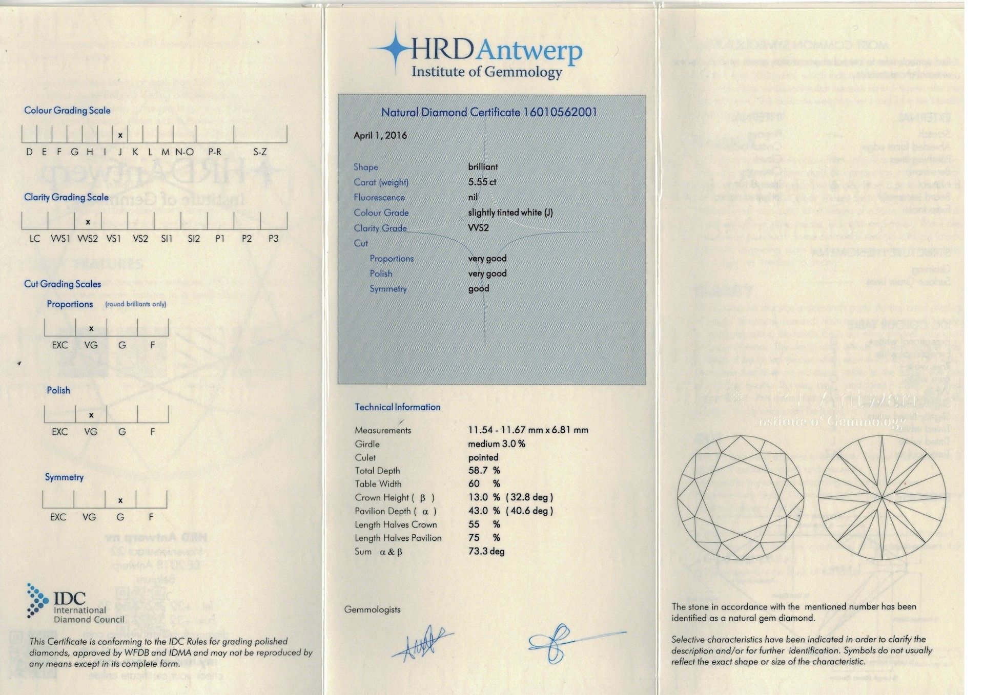 Diamante taglio brillante di ct 5.55, colore J, caratteristiche interne VVS2, fluorescenza [..]