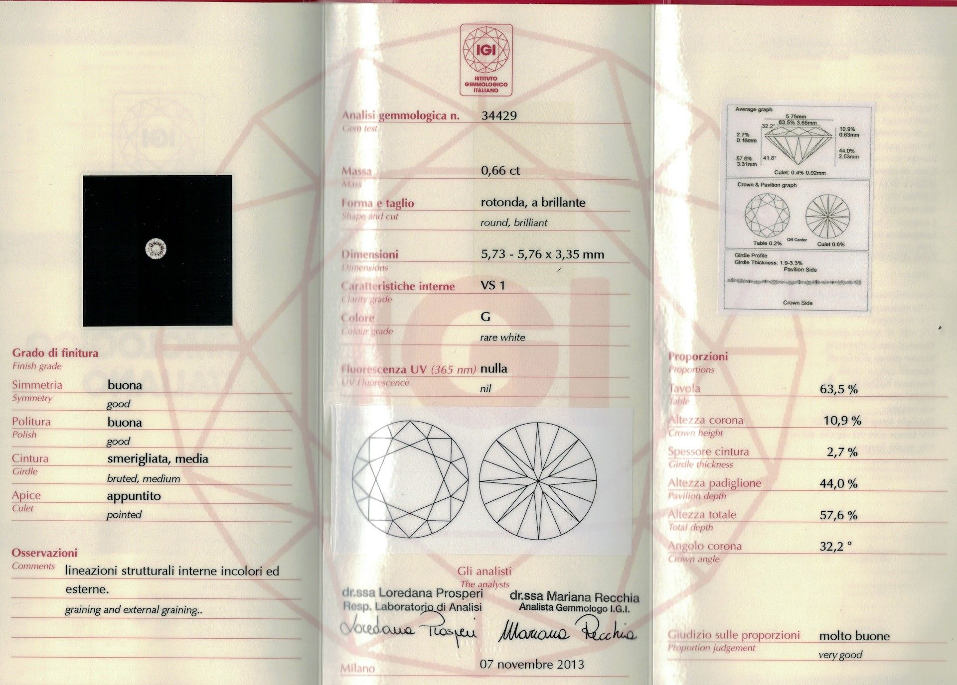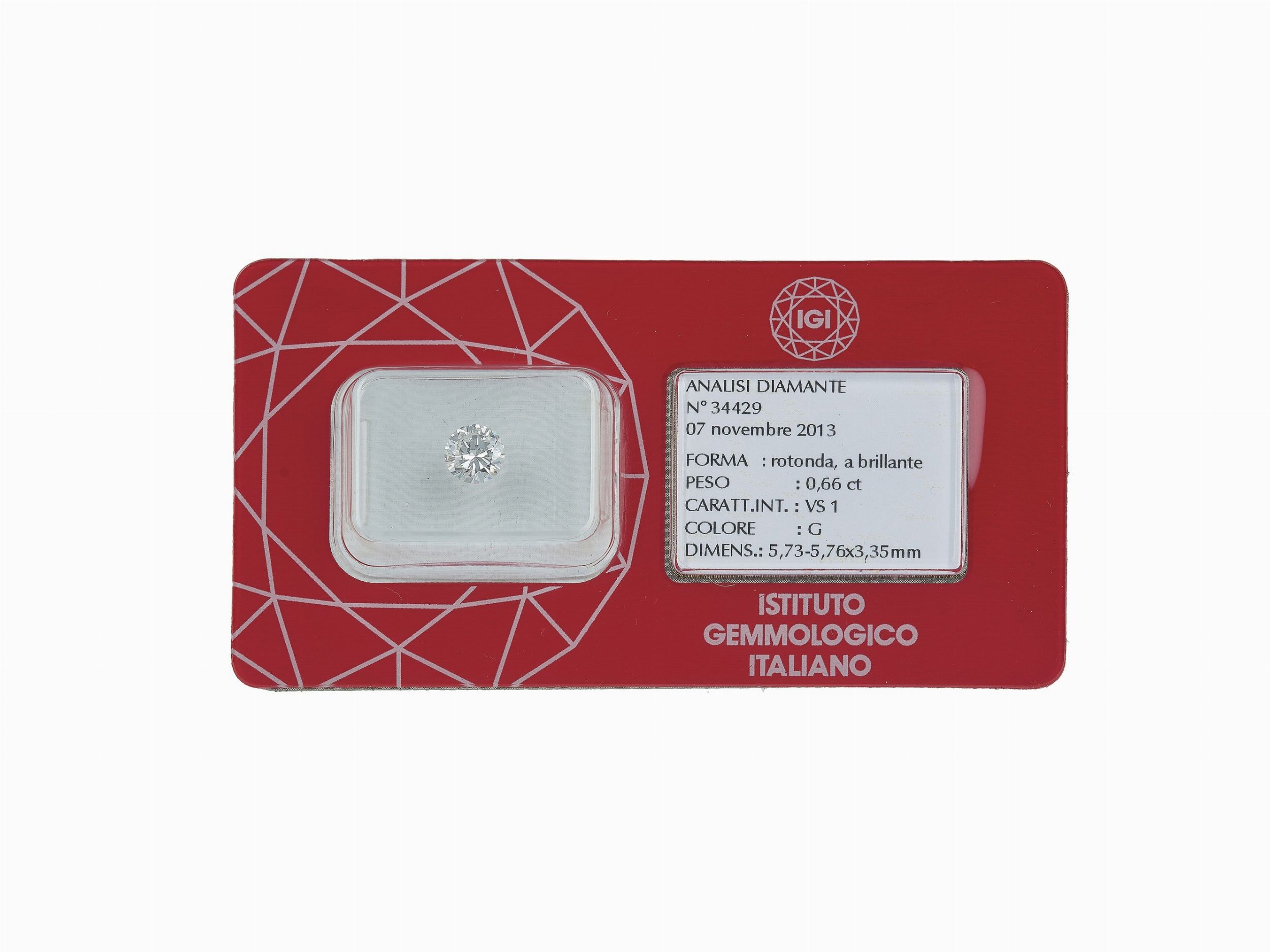 Diamante taglio rotondo a brillante di ct 0.66, colore G, caratteristiche interne [..]
