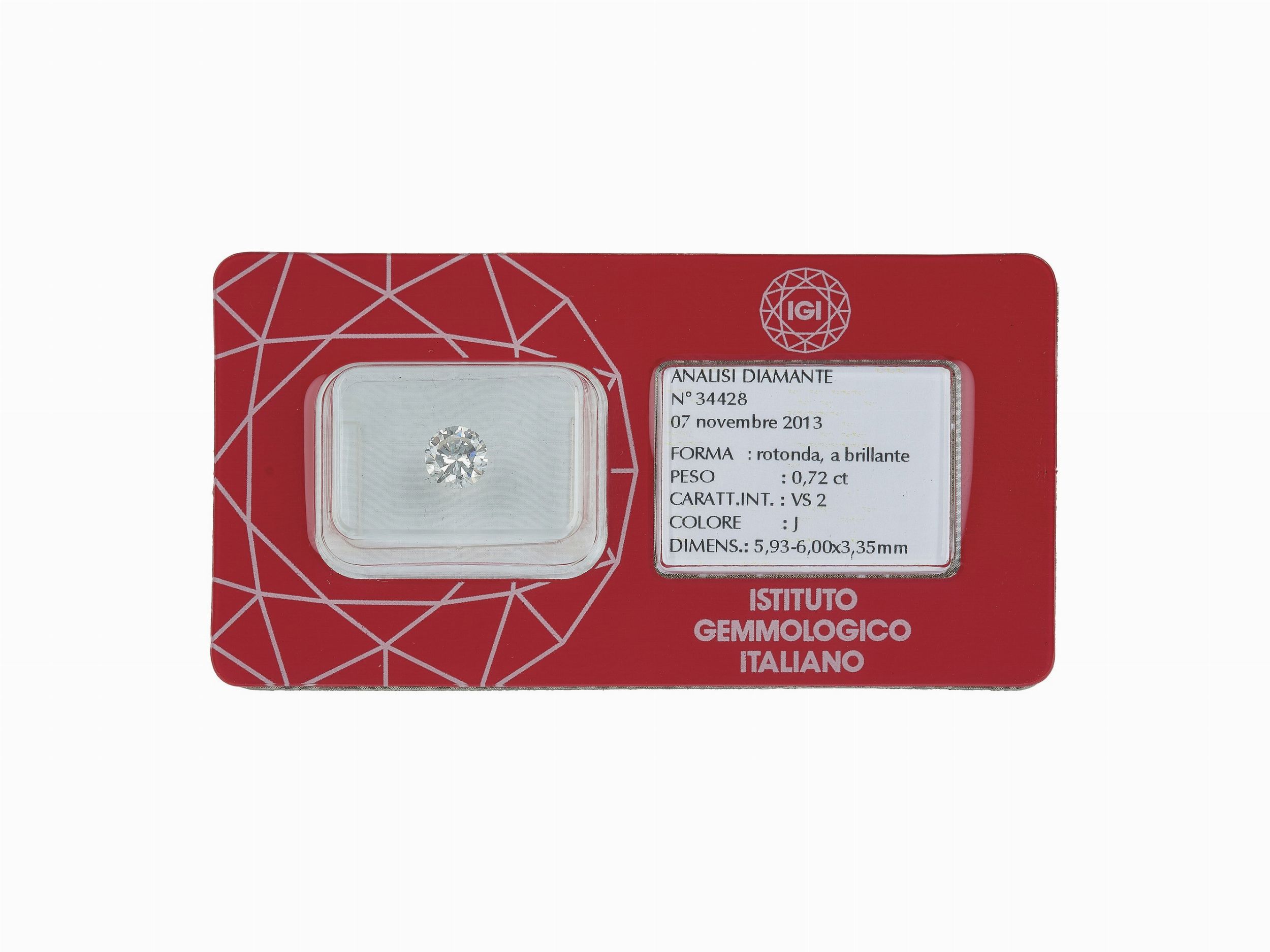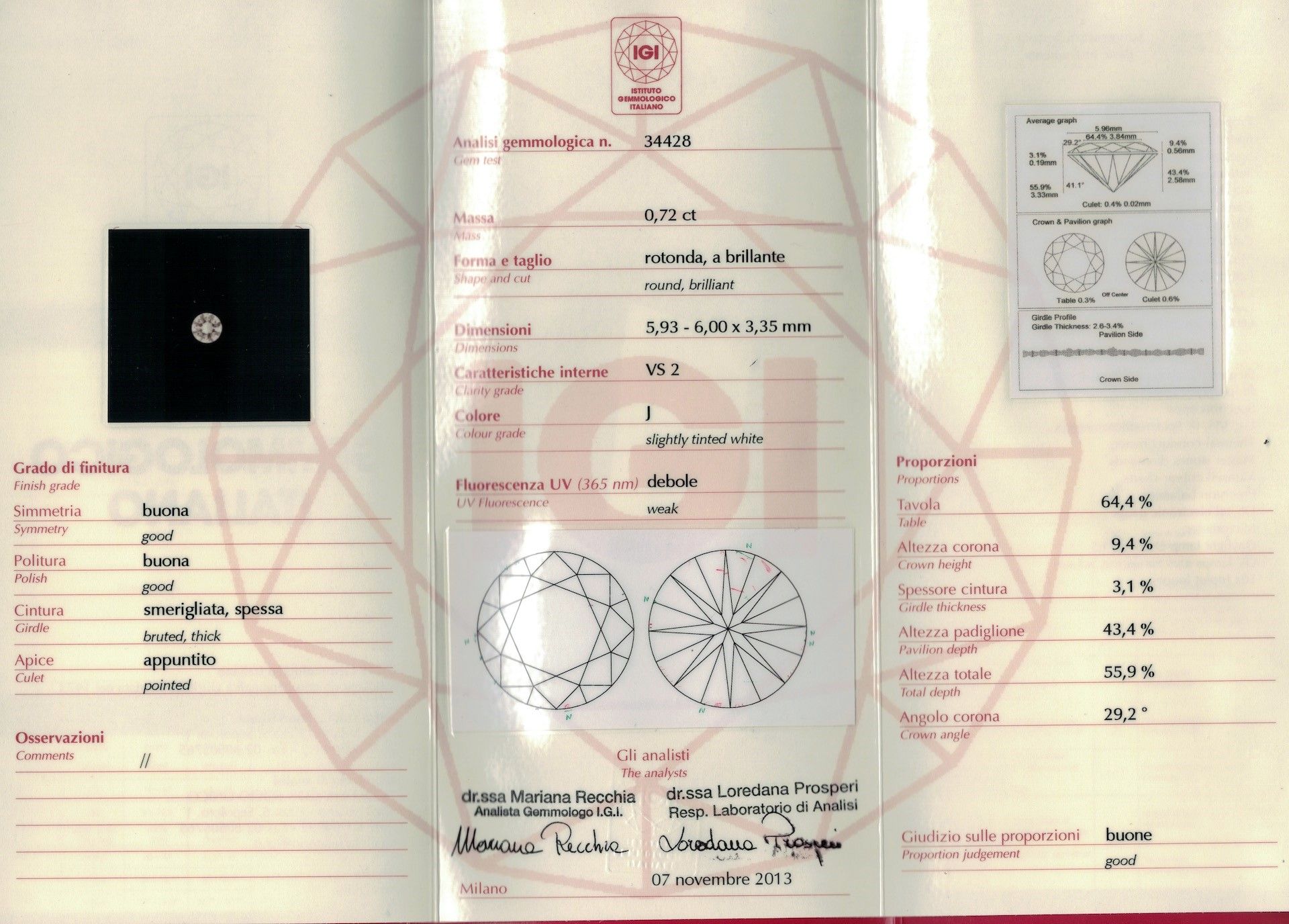 Diamante taglio rotondo a brillante di ct 0.72, colore J, caratteristiche interne [..]