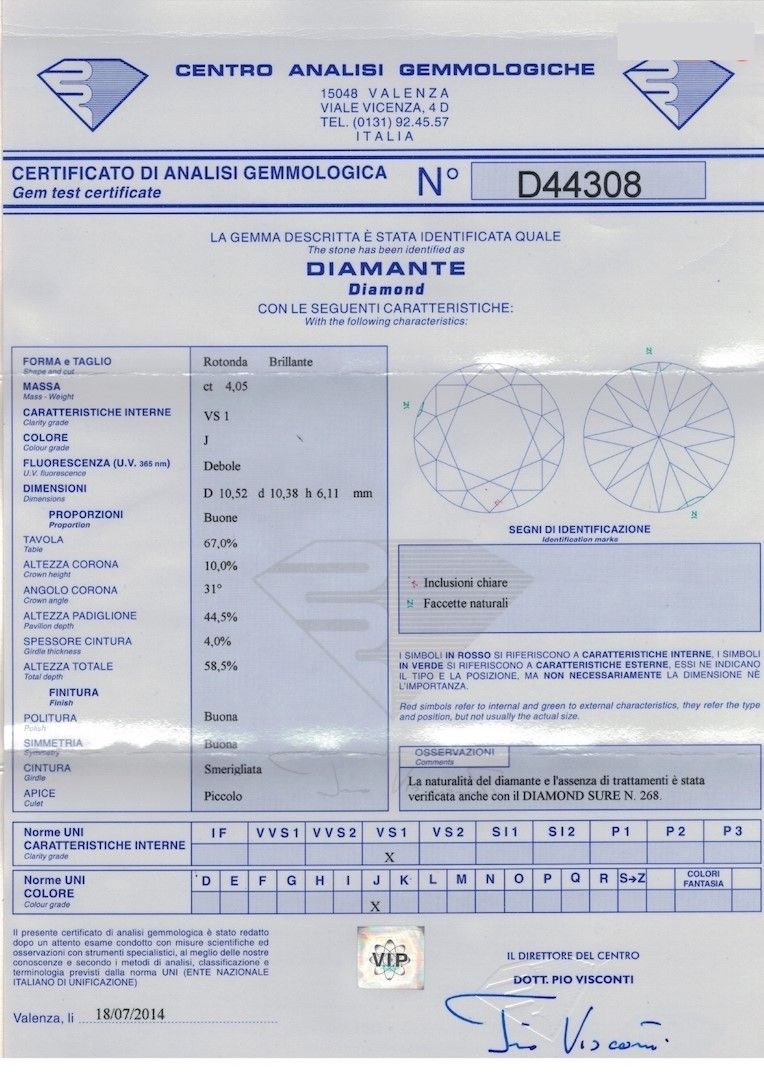 Diamante taglio rotondo a brillante di ct 4.05, colore J, caratteristiche interne [..]