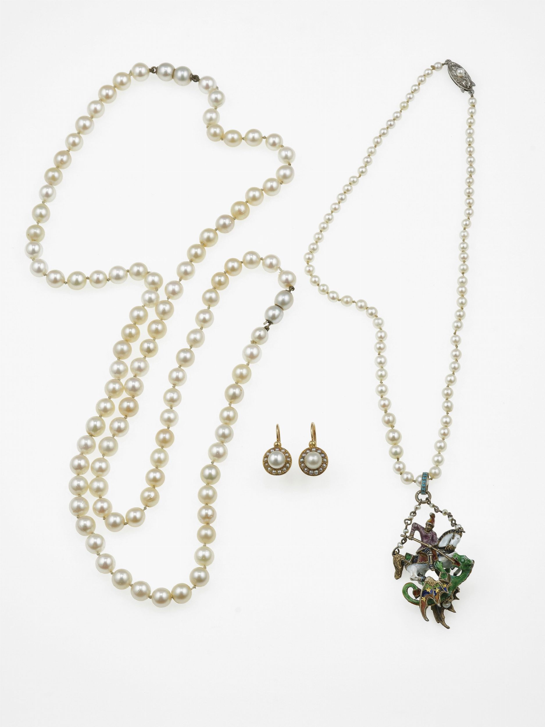 Lotto composto da due collane con perle, una con pendente in smalti policromi, ed [..]