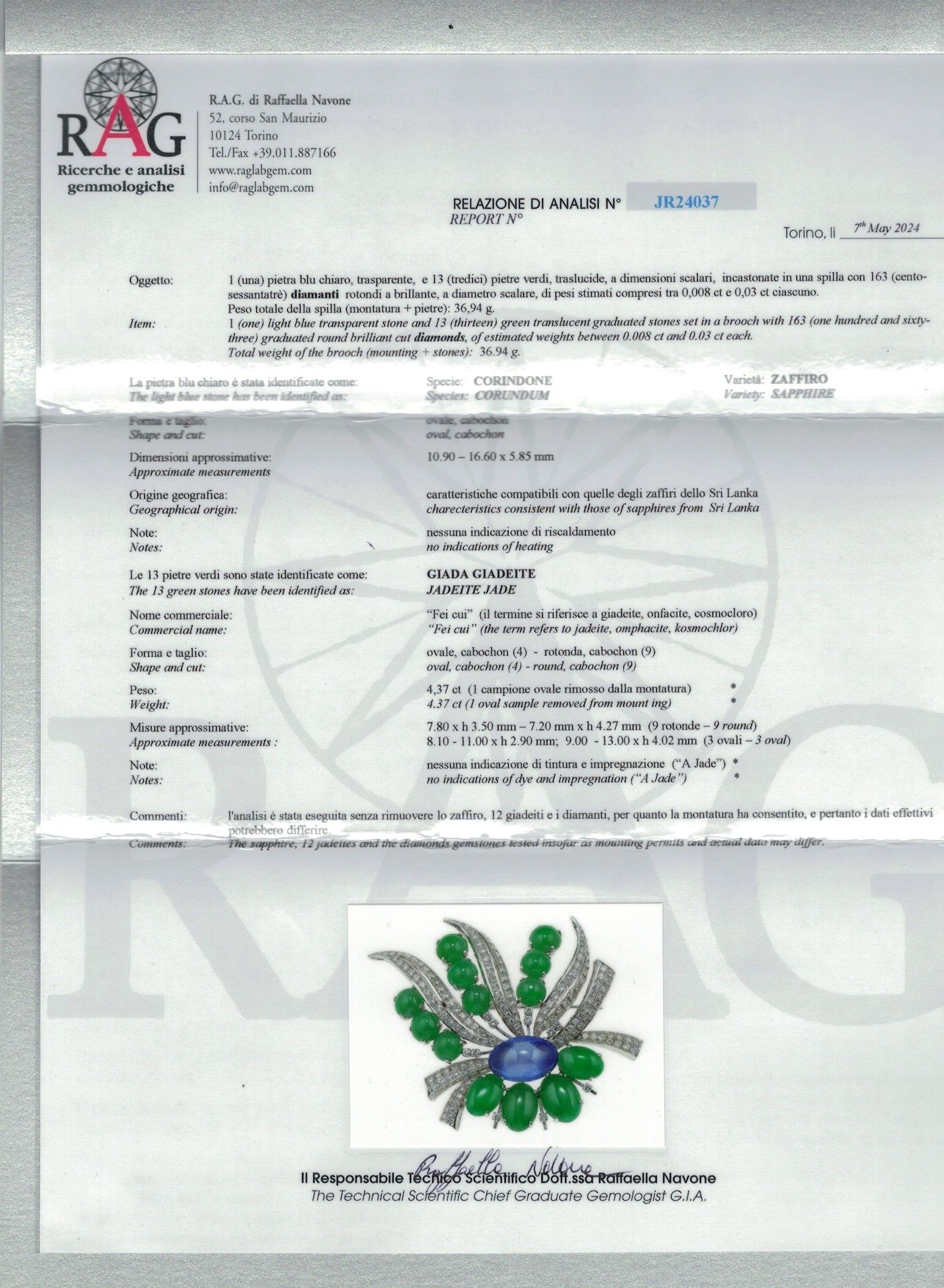 Spilla con zaffiro Sri Lanka, taglio cabochon, giadeiti Fei cui e diamanti