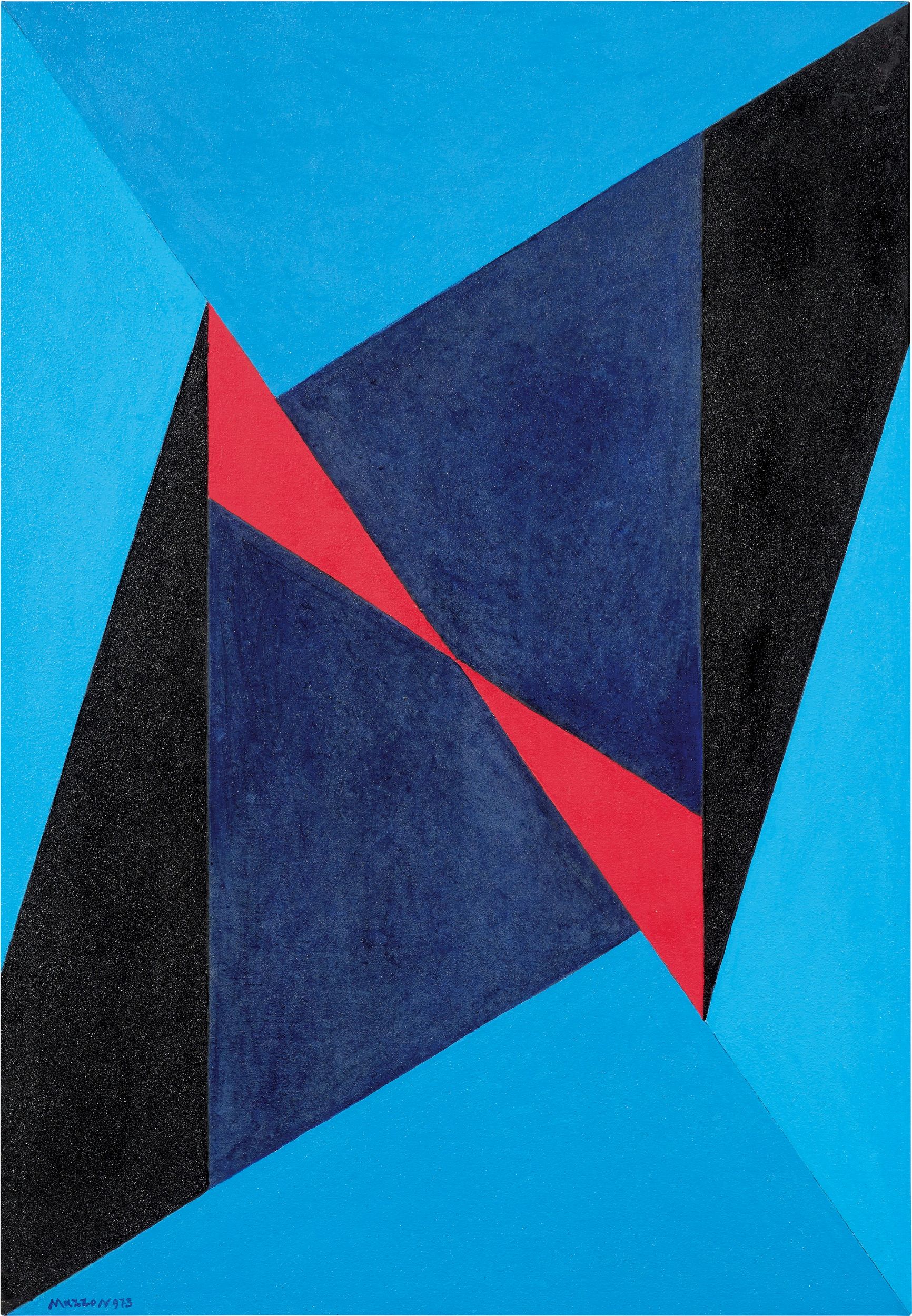 Olio su tela, cm 100x70 1973 Firma e data in basso a sinistra: Mazzon 973; firma, data, dedica e scritta al verso sulla tela: Mazzon / 973 / Per Giraldi / è Arù [Zuiraq] grande spirito / senza spazio di tempo e di luogo; titolo, data e firma sul telaio: D-466 Attrazione n. 4 con variazioni del bozzetto (D-455) / 1973 / Galliano Mazzon / 1973.