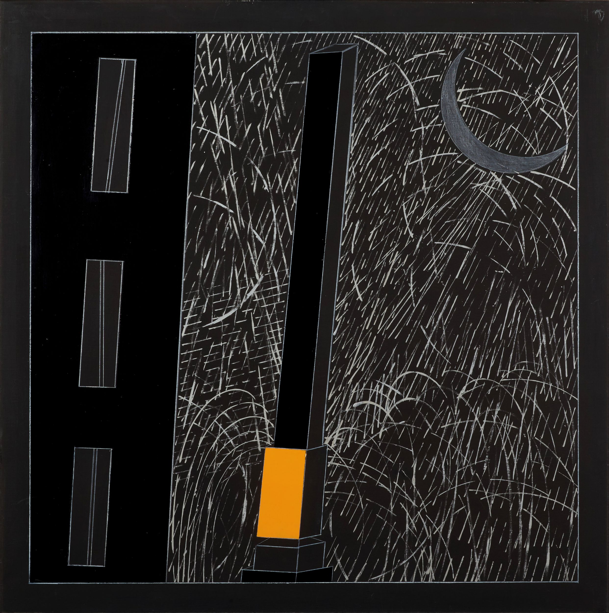 Acrilico su tela, cm 80,5x80,5 1988 Firma, titolo e data al verso sulla tela: Franco Angeli / 'Sabaudia' / 1988; sul telaio: etichetta Il Disegno Italiano / La Scaletta / Galleria - Edizioni d'Arte / S. Polo di Reggio Emilia: timbro Galleria La Scaletta.