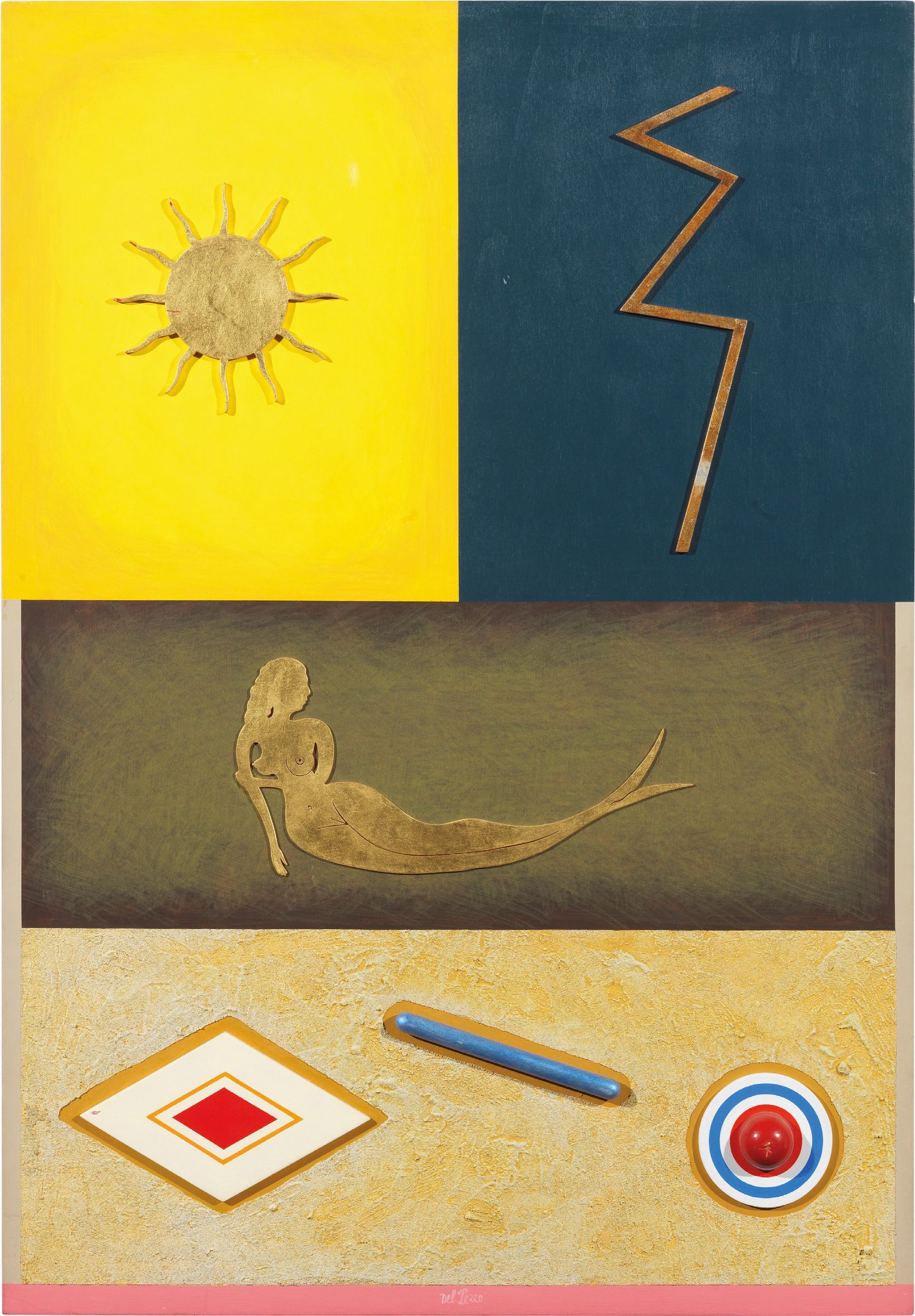 Collage, acrilico, smalto, oro in foglie e sabbia su tavola, cm 100x70 2004 Firma e titolo al verso: Lucio Del Pezzo / 'Sirena Partenope': due etichette e timbro Galleria d'Arte Giorgio Ghelfi, Verona: etichetta Studio Guastalla Arte Moderna e Contemporanea, Milano.