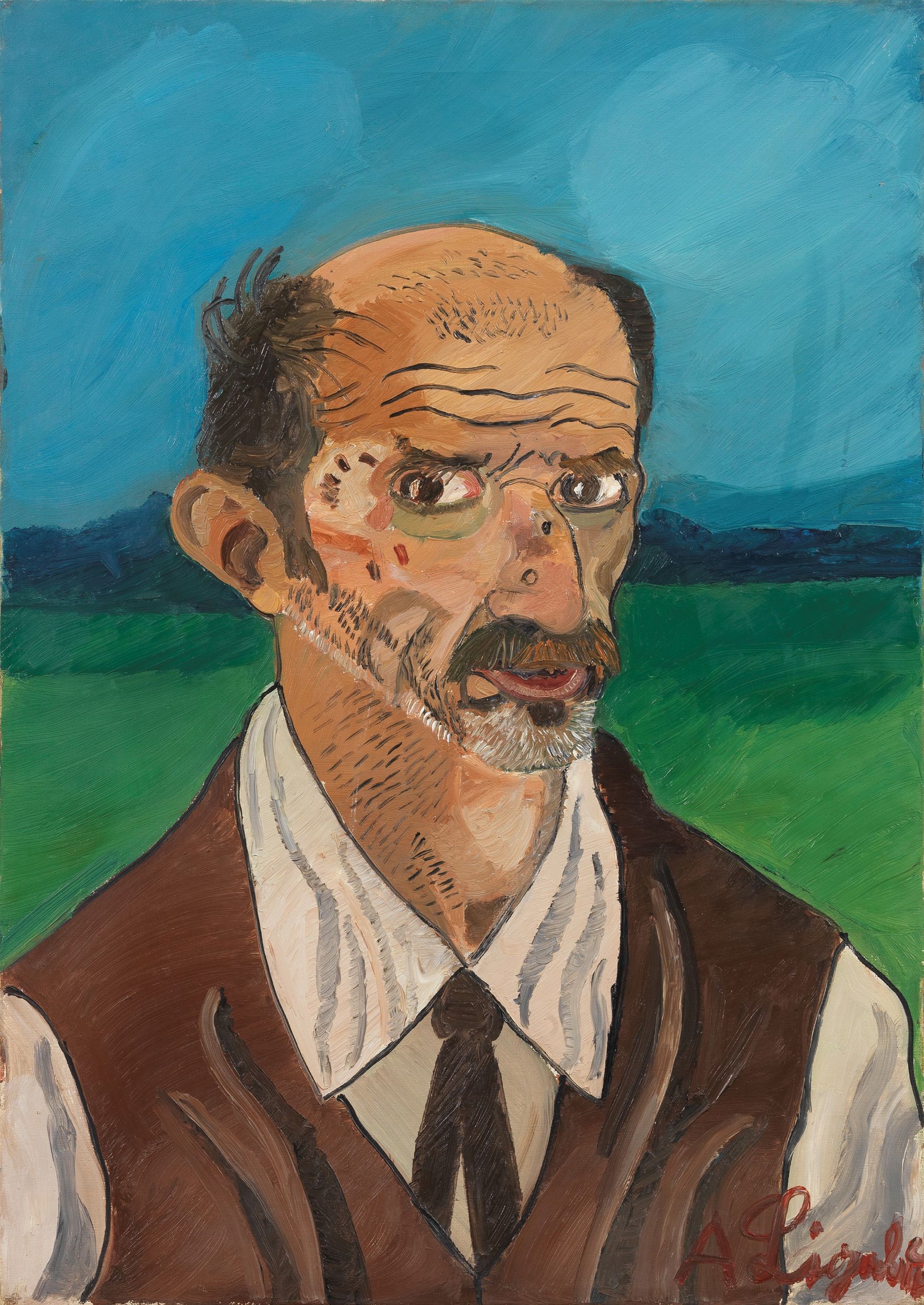 Olio su tela, cm 70x50 1959-60 Firma in basso a destra: A. Ligabue. Dichiarazione di autenticità di Sergio Negri al verso sulla tela: Opera autentica di / Antonio Ligabue / III periodo / (1952-62) dipinto intorno agli / anni 1959-60 / In fede / Sergio Negri / Gualtieri 11/06/02: quattro firme Sergio Negri: numero di archivio 546/P. III: due timbri Galleria Sagittario, Salsomaggiore Terme; sulla cornice: etichetta Galleria Centro Steccata, Parma.