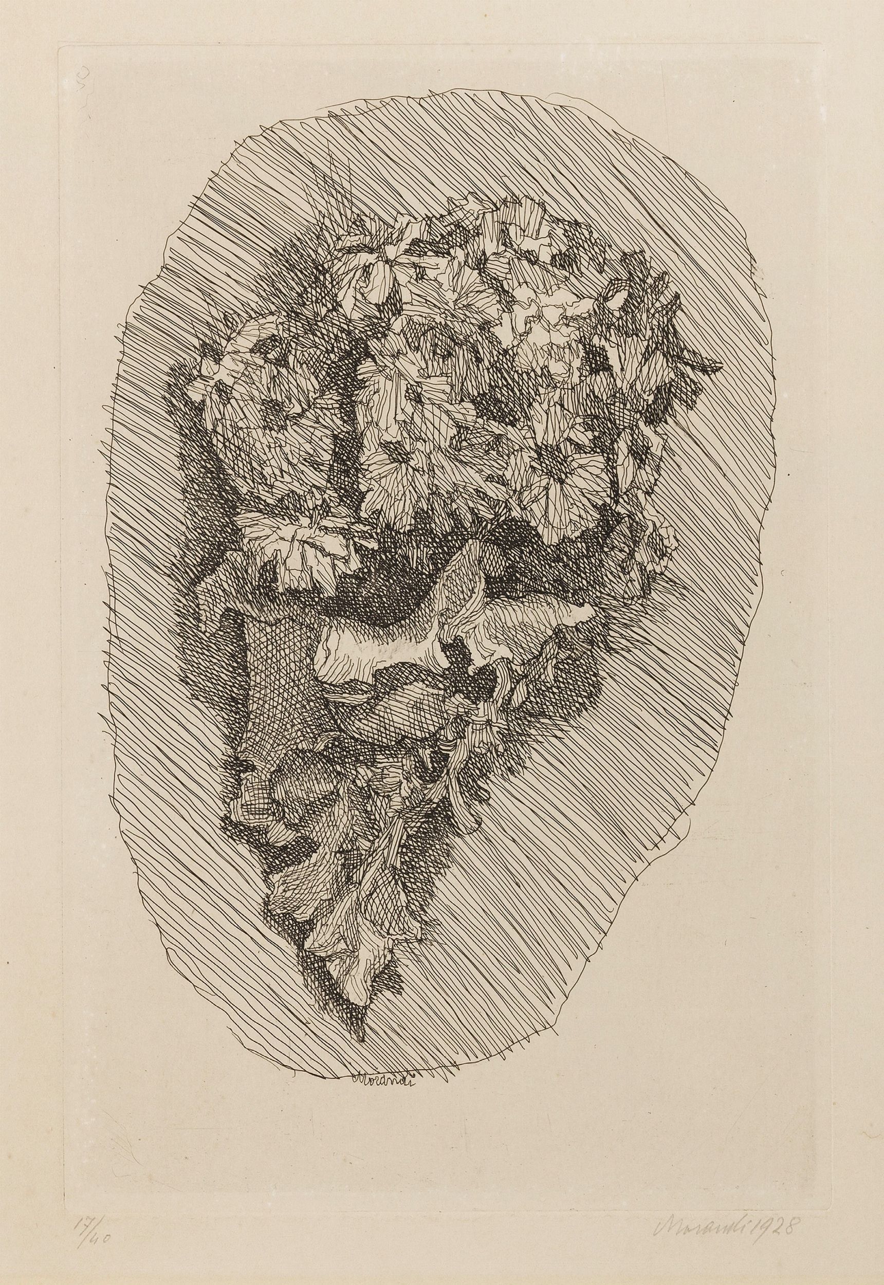 1929 Firma in lastra in basso al centro: Morandi, firma e data a matita sul margine in basso a sinistra: Morandi 1928, tiratura in basso a sinistra: 17/40. Al verso: timbro Galleria del Milione, Milano, con n. 5352/3.