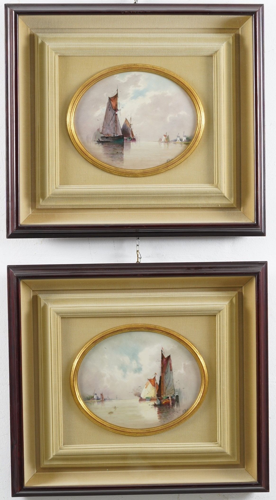 James Edwin Dean Coppia di targhe ovali su porcellana con vedute marine con barc [..]