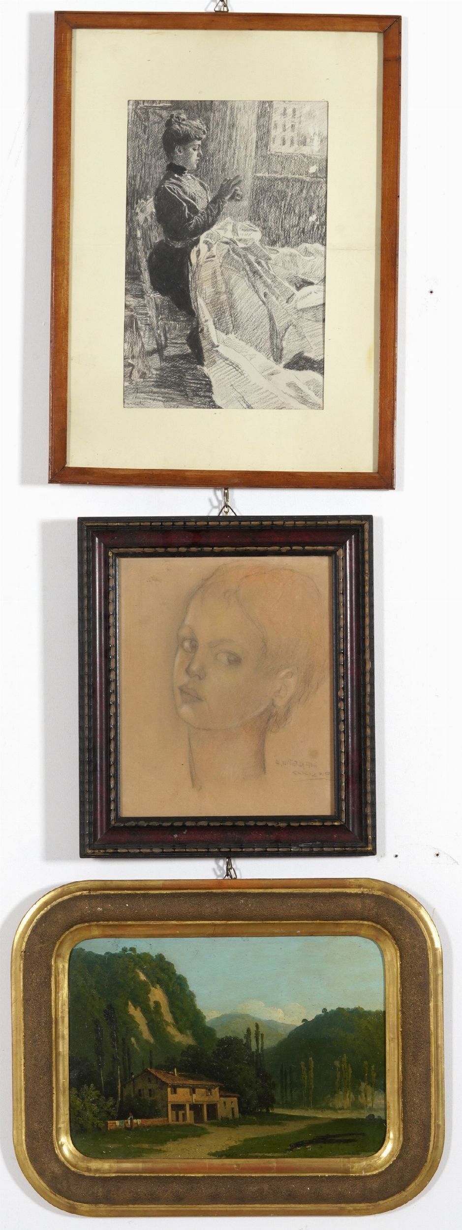 lotto di un dipinto “Paesaggio con casa”; Disegno “Testa di donna”; Disegno “Donna [..]