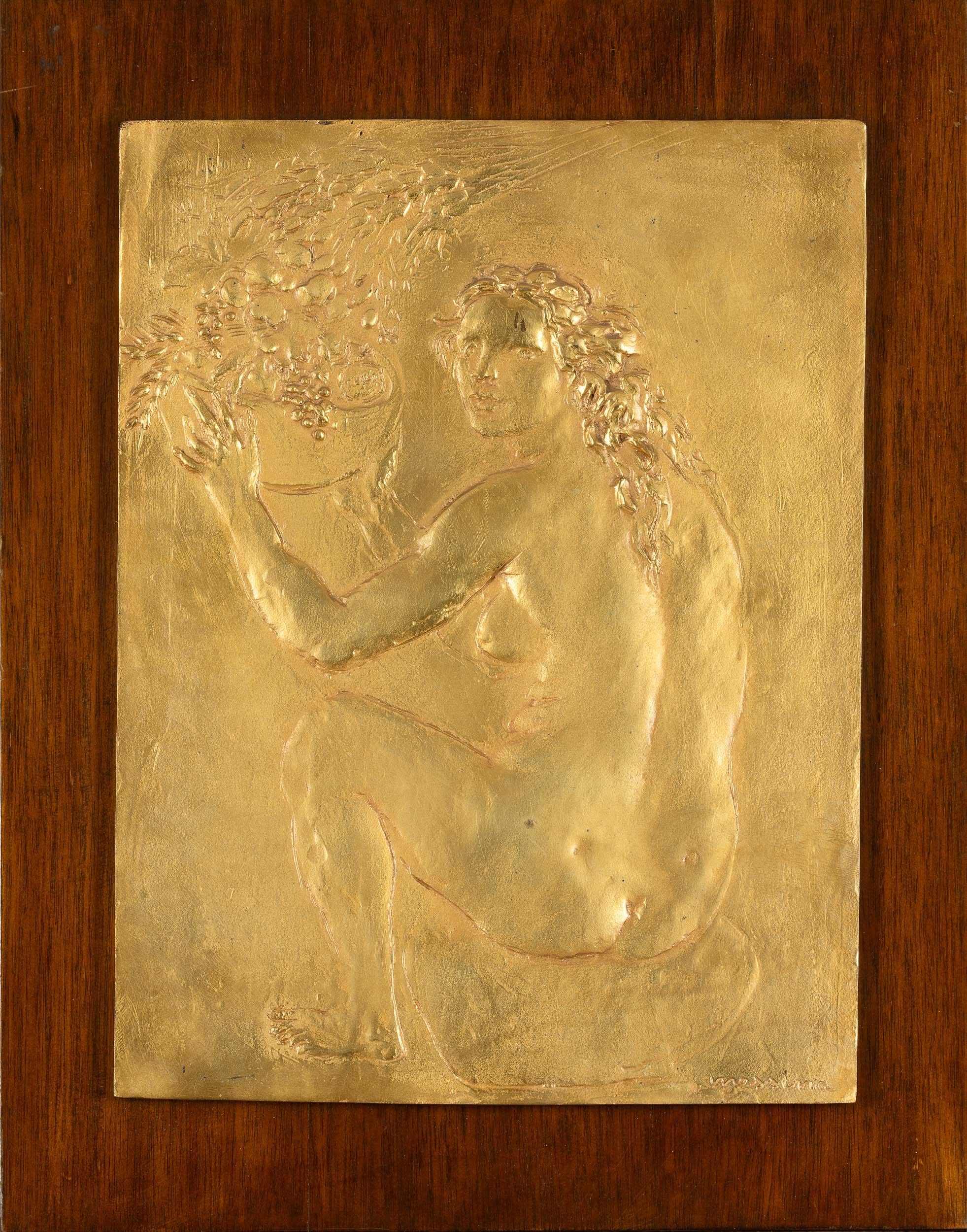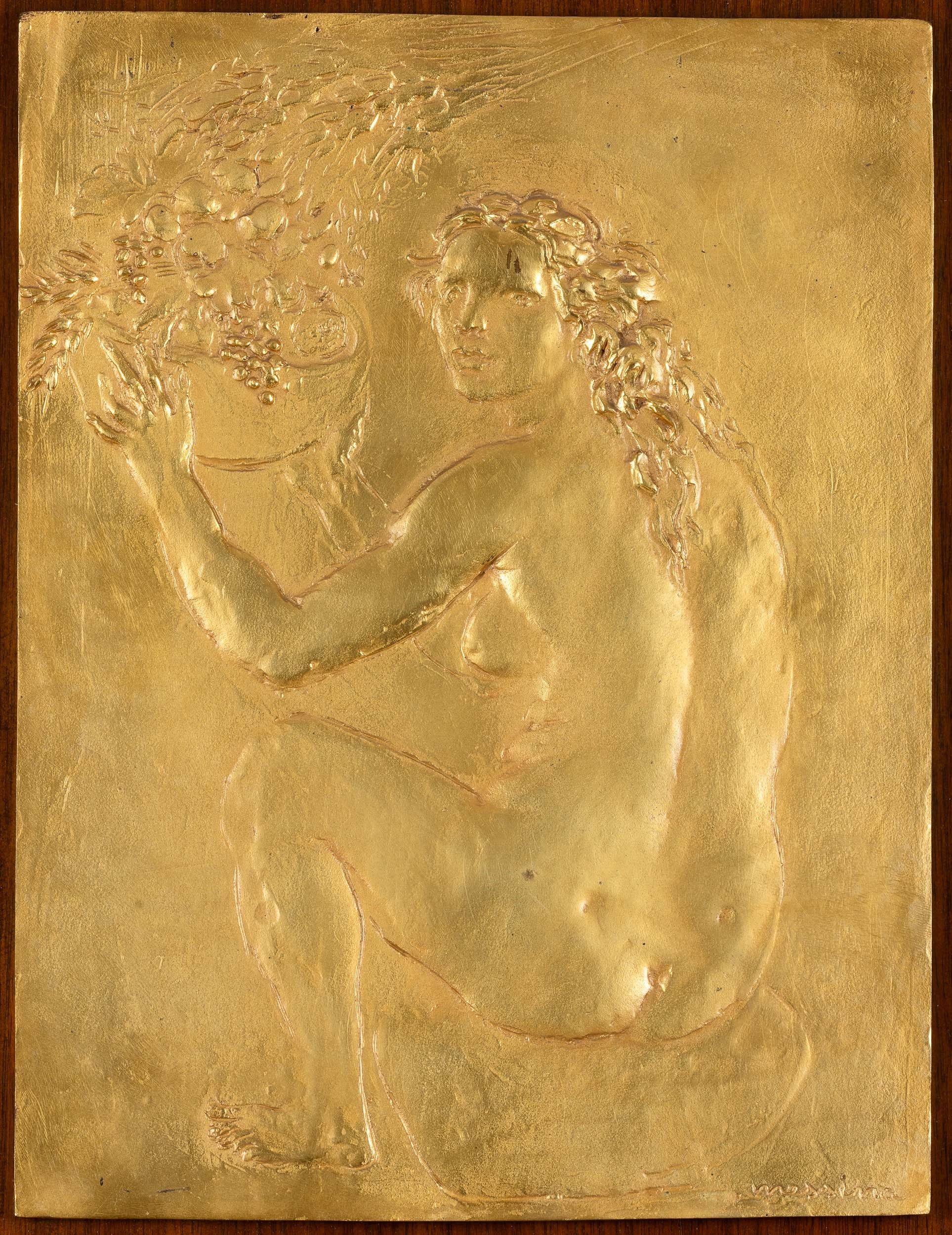 bassorilievo in bronzo dorato su tavola in legno, Largh. 29,5 - Alt. 39,5 cm