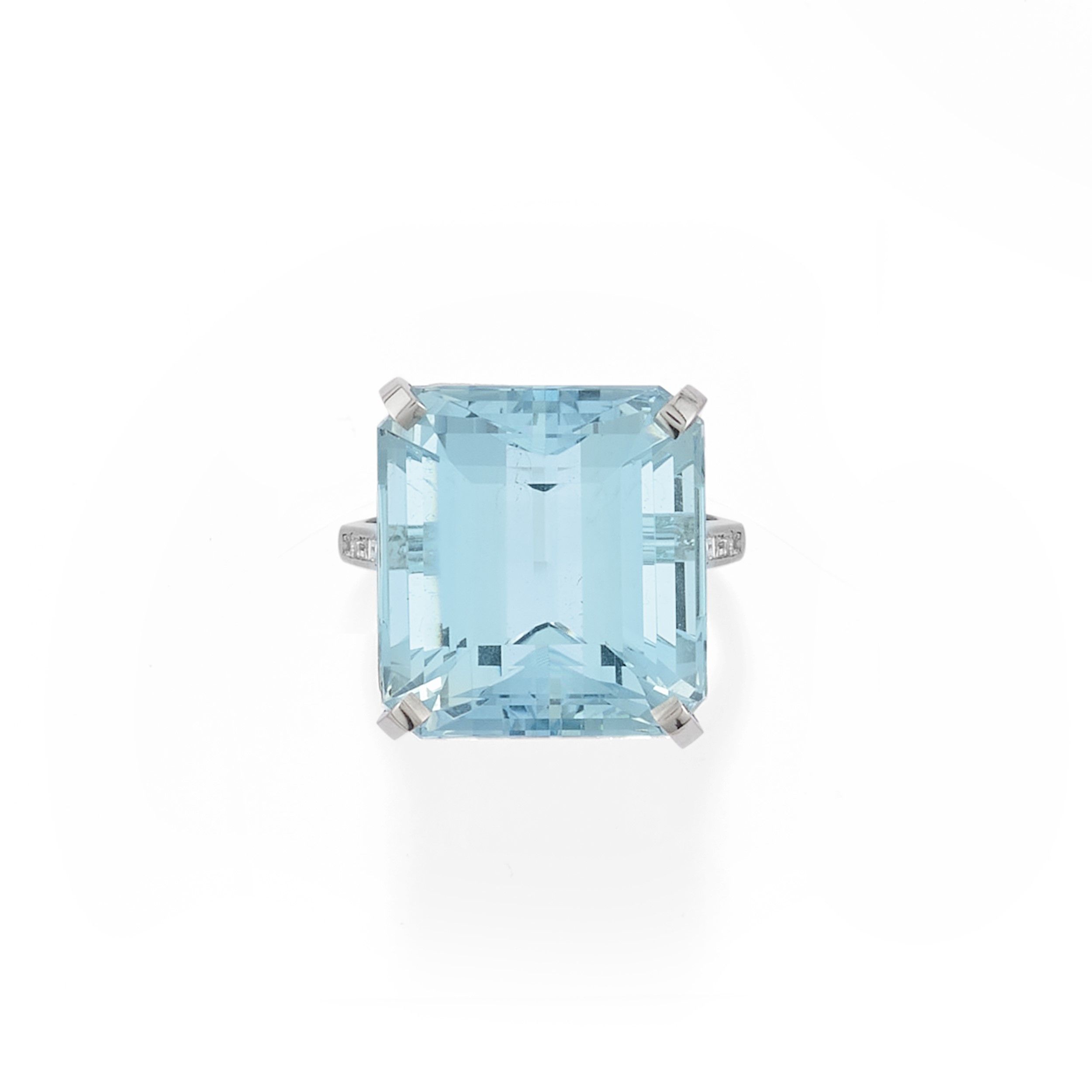 con acquamarina taglio rettangolare a contorno ottagonale di ct 27,97 (caratura incisa), diamanti taglio baguette.