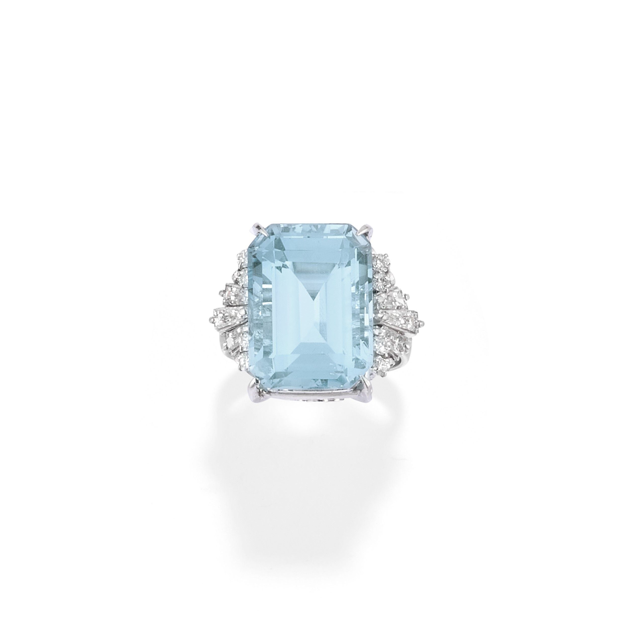 al centro acquamarina taglio rettangolare a contorno ottagonale di ct 12,12 (caratura incisa) e ai lati diamanti taglio brillante e tapered baguette per totale ct 0,85 (caratura incisa).