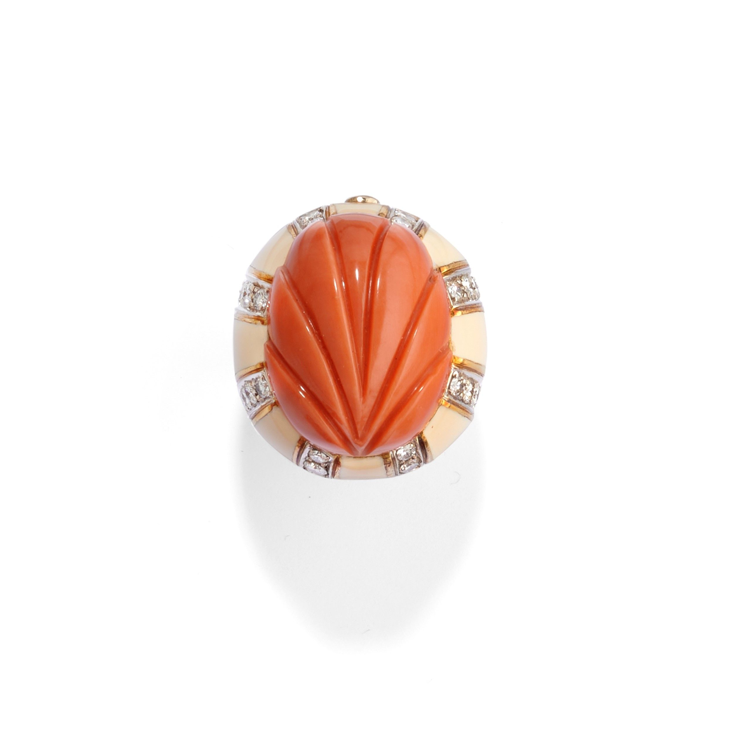 a cupola, con corallo arancio intagliato di forma ovale di mm 17,65x23,20x10,00 circa, smalto color panna e diamanti taglio brillante per totale ct 1,20 circa, firma parzialmente consunta.