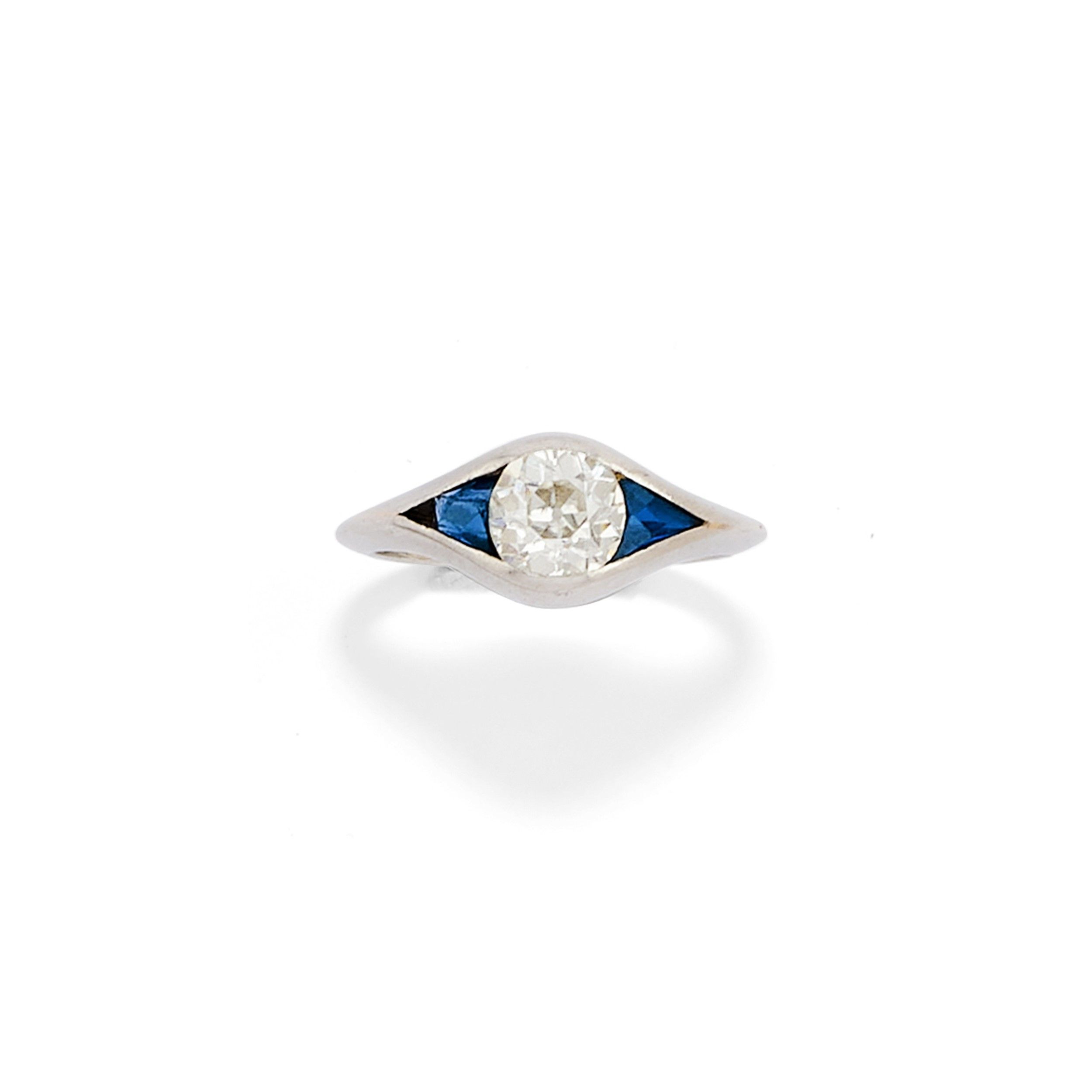 al centro diamante taglio vecchio di ct 1,00 circa, ai lati due zaffiri taglio fantasia, difetti (uno zaffiro presenta visibili mancanze di materiale).
