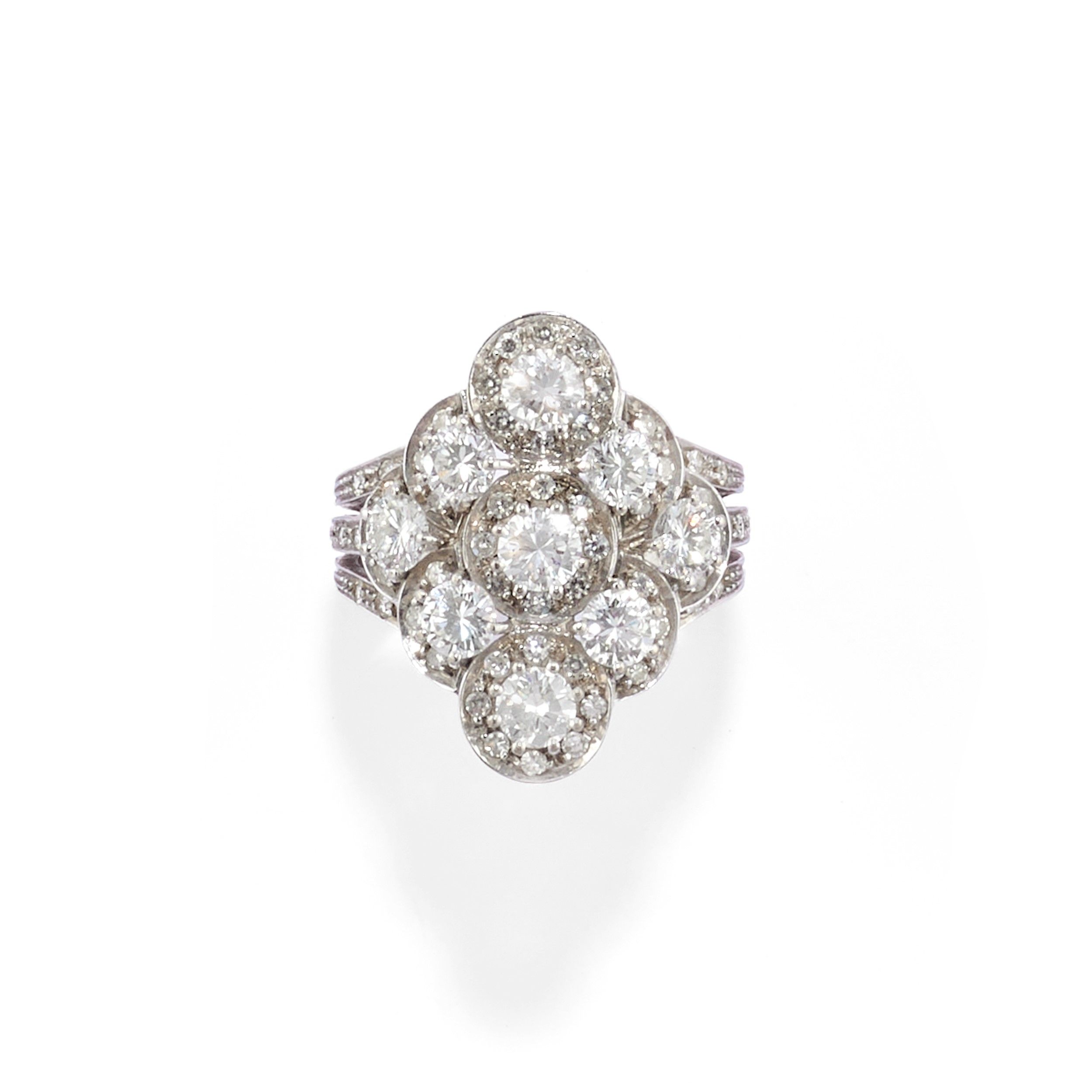 motivo a losanga, con diamanti taglio brillante e huit-huit per totale ct 2,00 circa.