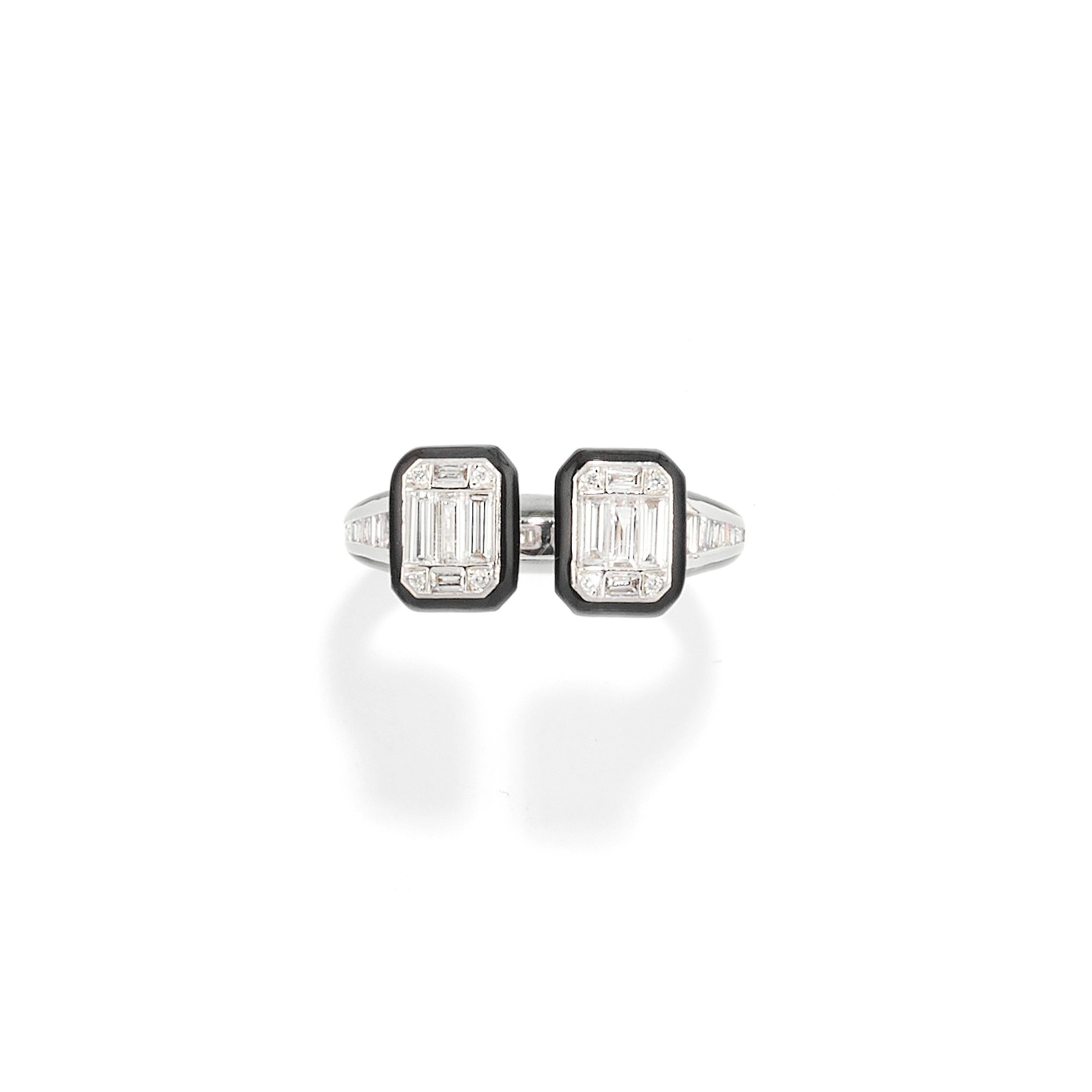 a motivi ottagonali contrapposti, diamanti taglio baguette e brillante per totale ct 0,80 circa e smalto nero.