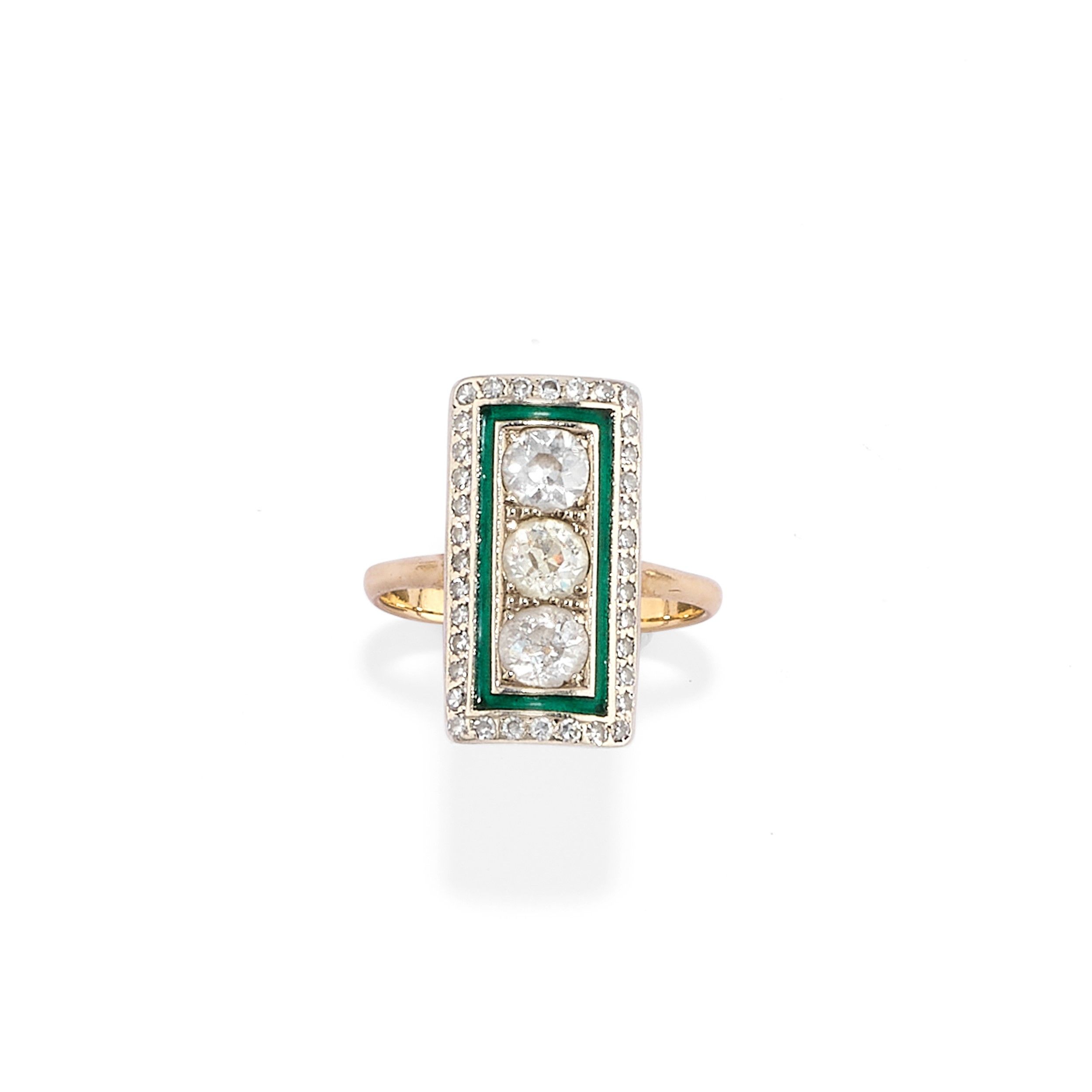 al centro tre diamanti taglio vecchio per totale ct 1,20 circa entro cornice in smalto e diamanti taglio huit-huit.