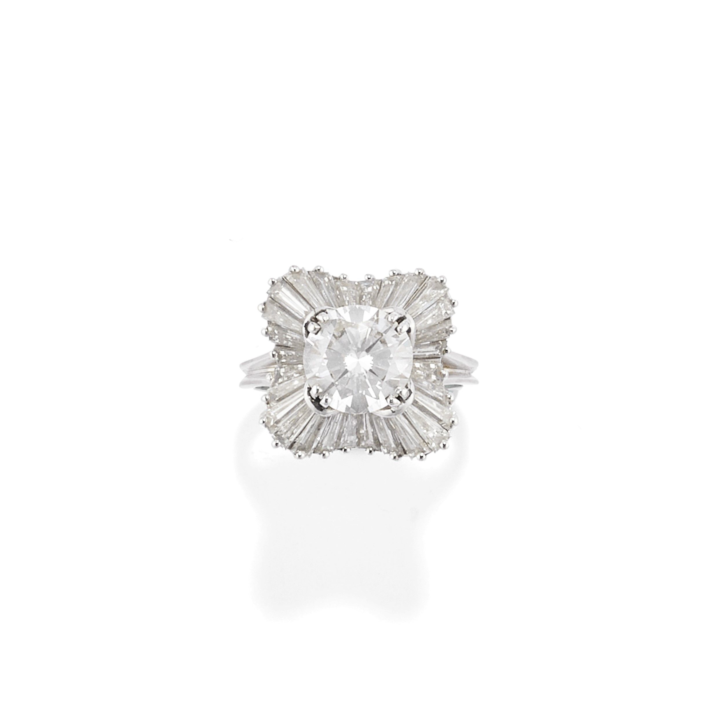 al centro diamante taglio brillante di ct 2,00 circa (prob. colore F/G, purezza VS/VVS), contornato da motivo ondulato in diamanti taglio tapered baguette per totale ct 2,00 circa.