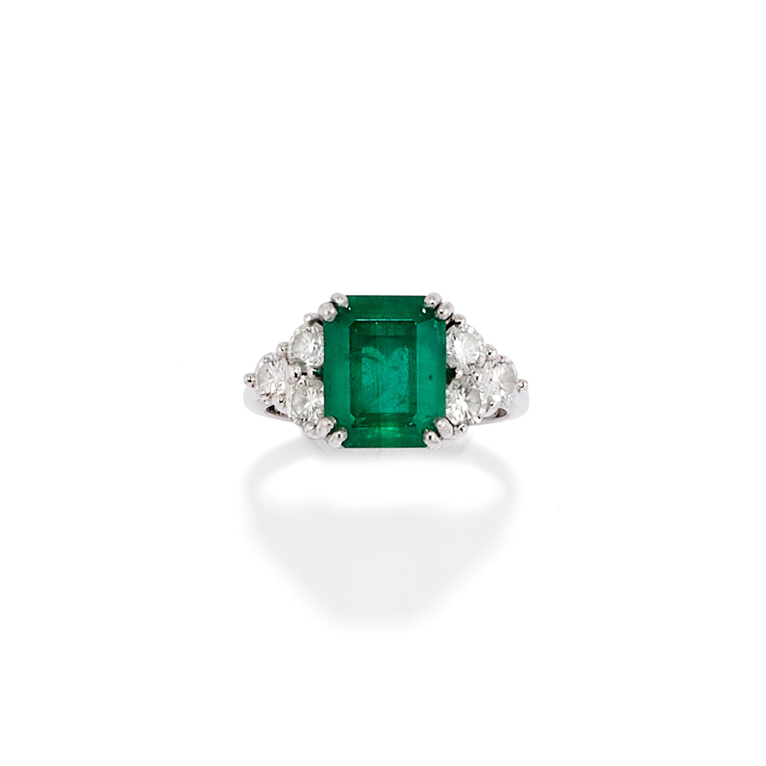 al centro smeraldo taglio rettangolare a contorno ottagonale di ct 3,00 circa, ai lati diamanti taglio brillante per totale ct 1,00 circa.