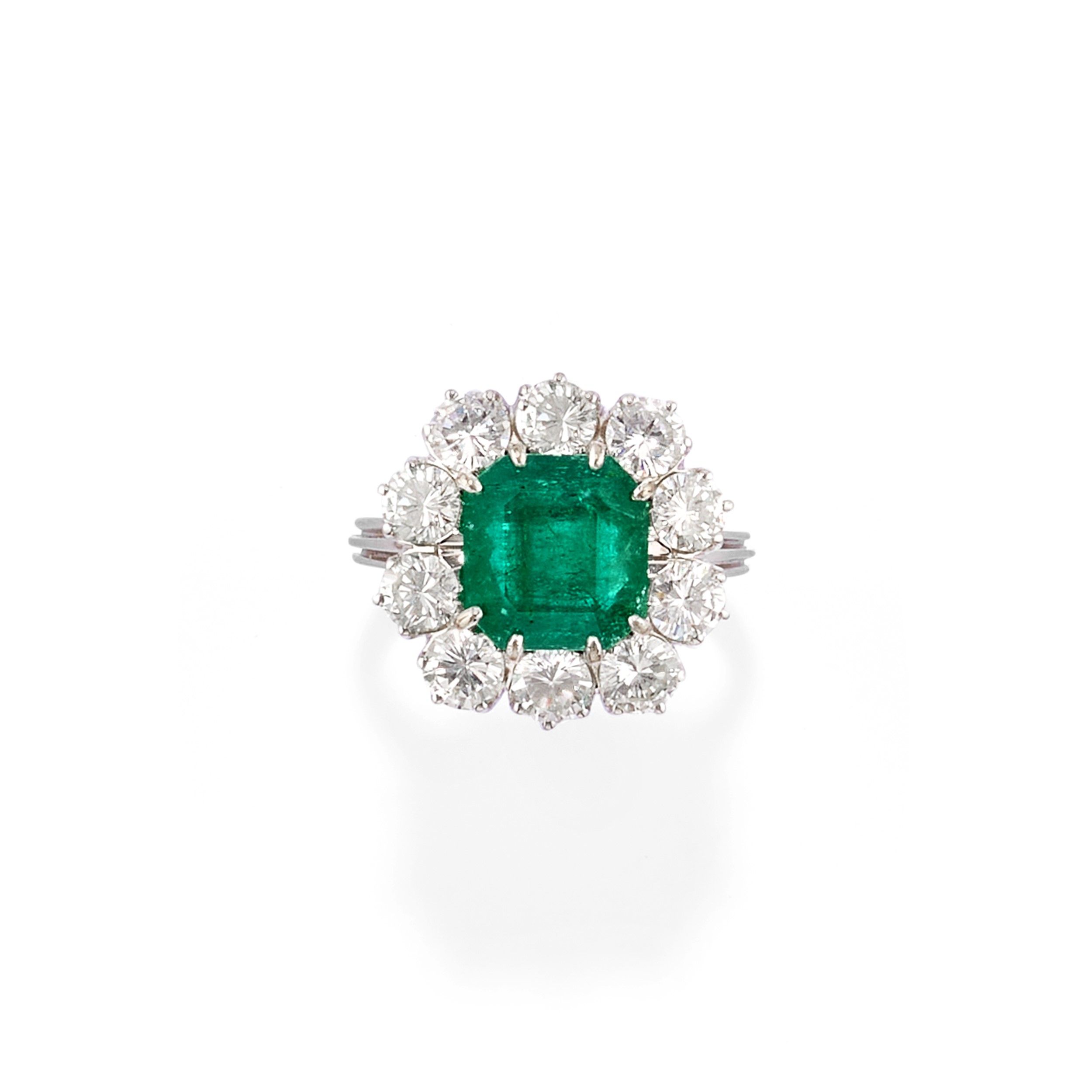 al centro smeraldo taglio rettangolare a contorno ottagonale di ct 3,80 circa, contorno in diamanti taglio brillante per totale ct 2,00 circa.