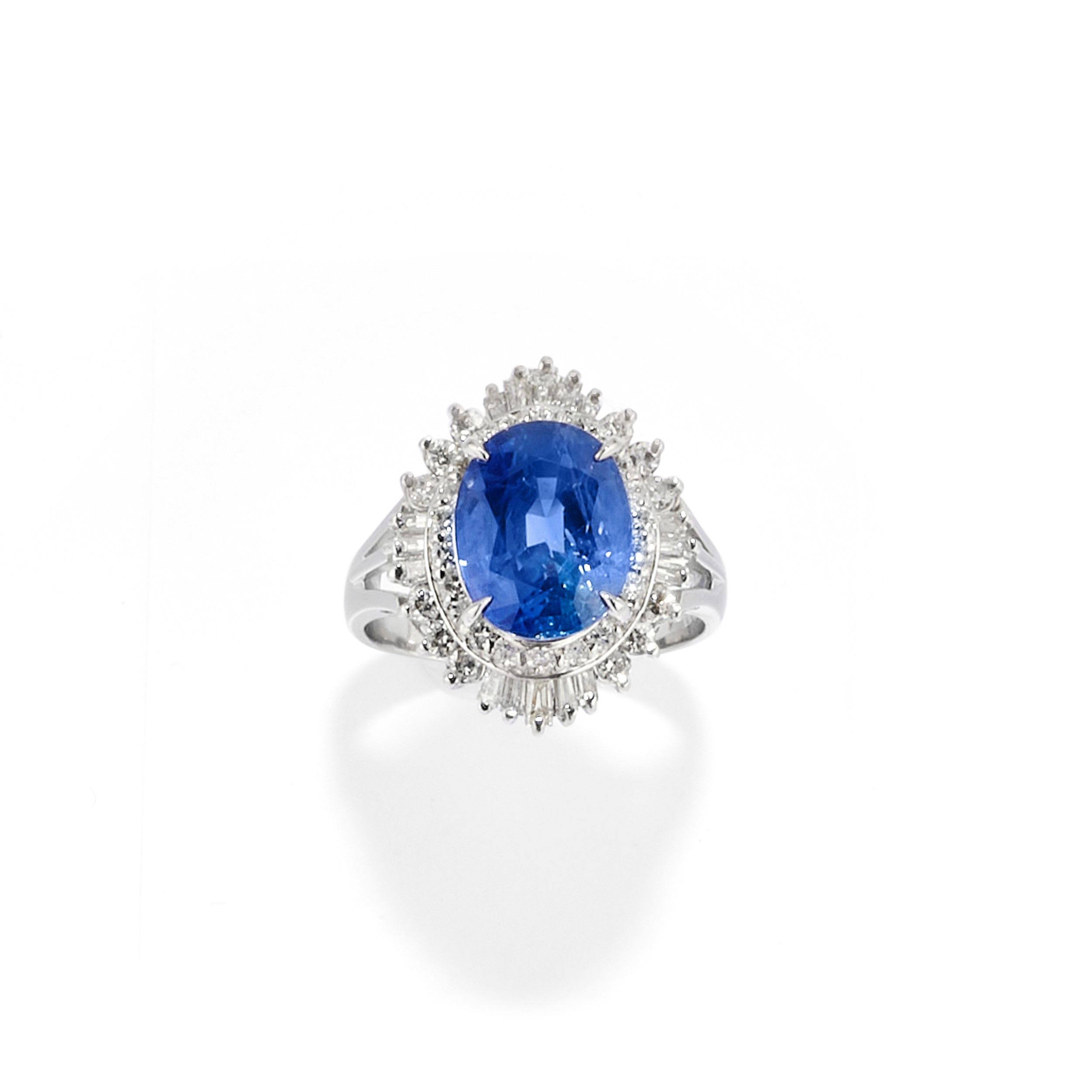al centro zaffiro taglio ovale di ct 4,70 (caratura incisa) entro contorno di diamanti taglio brillante e tapered baguette per totale ct 0,80 (caratura incisa).