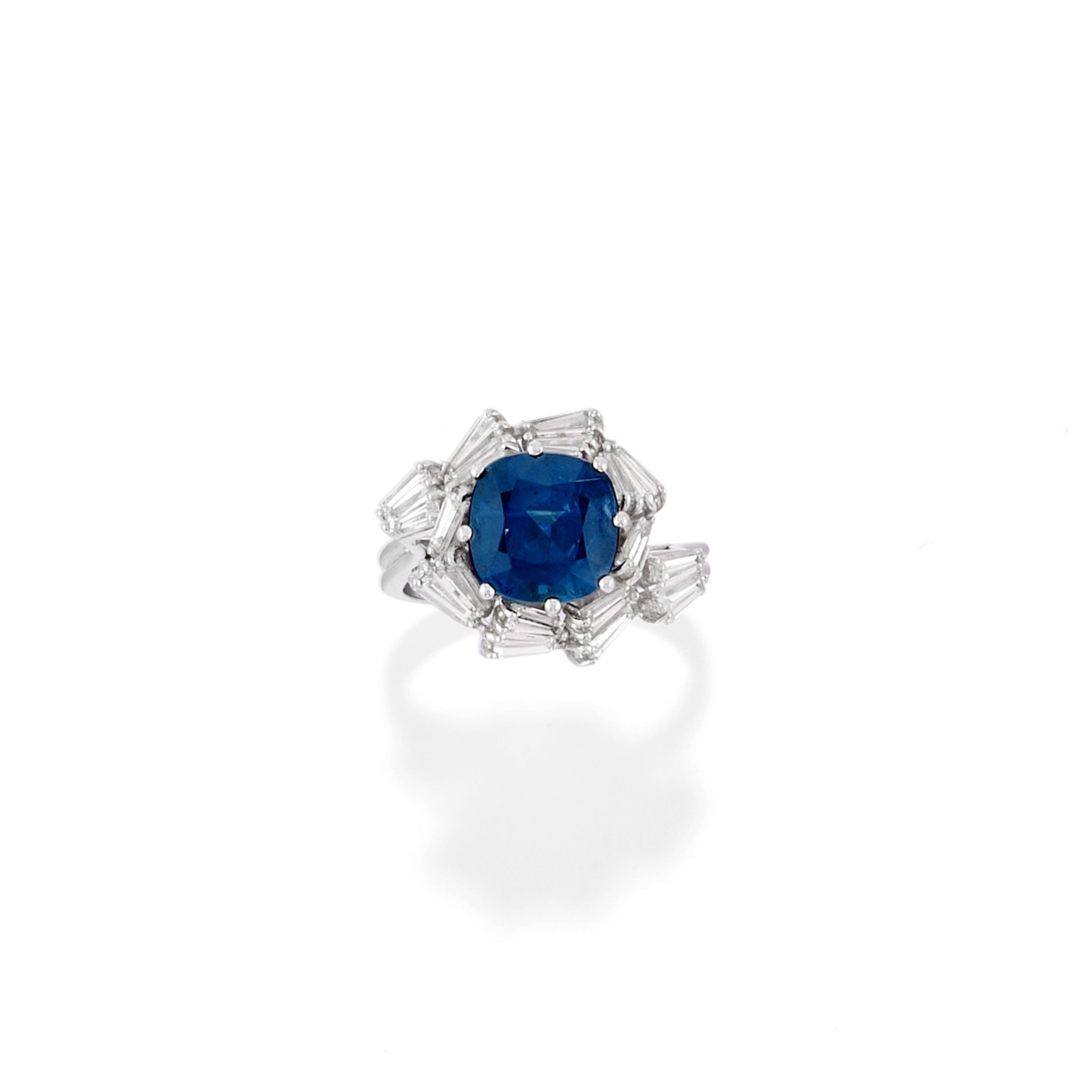 al centro zaffiro taglio cuscino di ct 4,35 circa, diamanti taglio tapered baguette per totale ct 1,00 circa.
