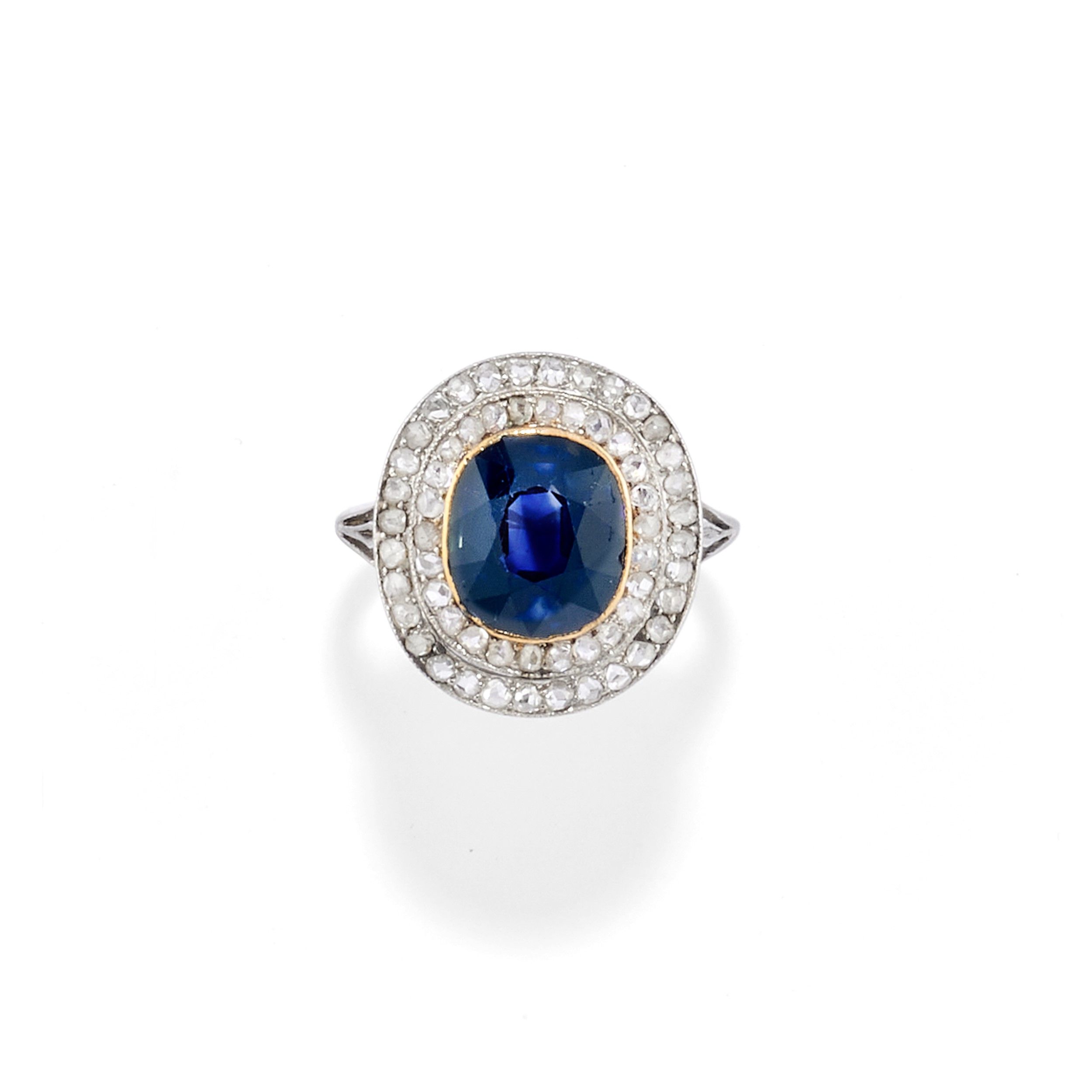 anni '20 con zaffiro taglio cuscino di ct 4,50 circa e doppio contorno in diamanti taglio rosa.