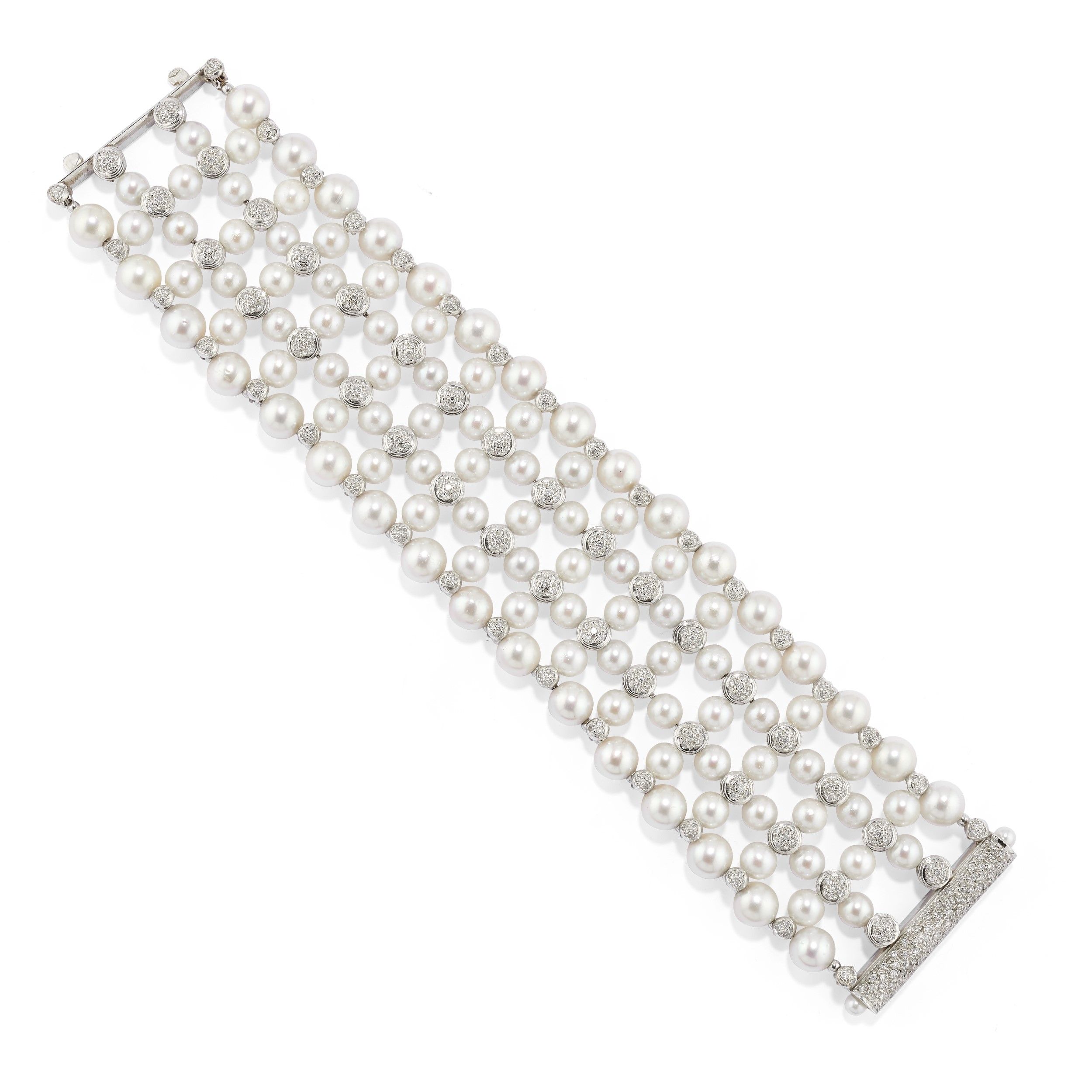disegno a intreccio, con perle coltivate di mm 8,00/6,00 circa e diamanti taglio brillante.