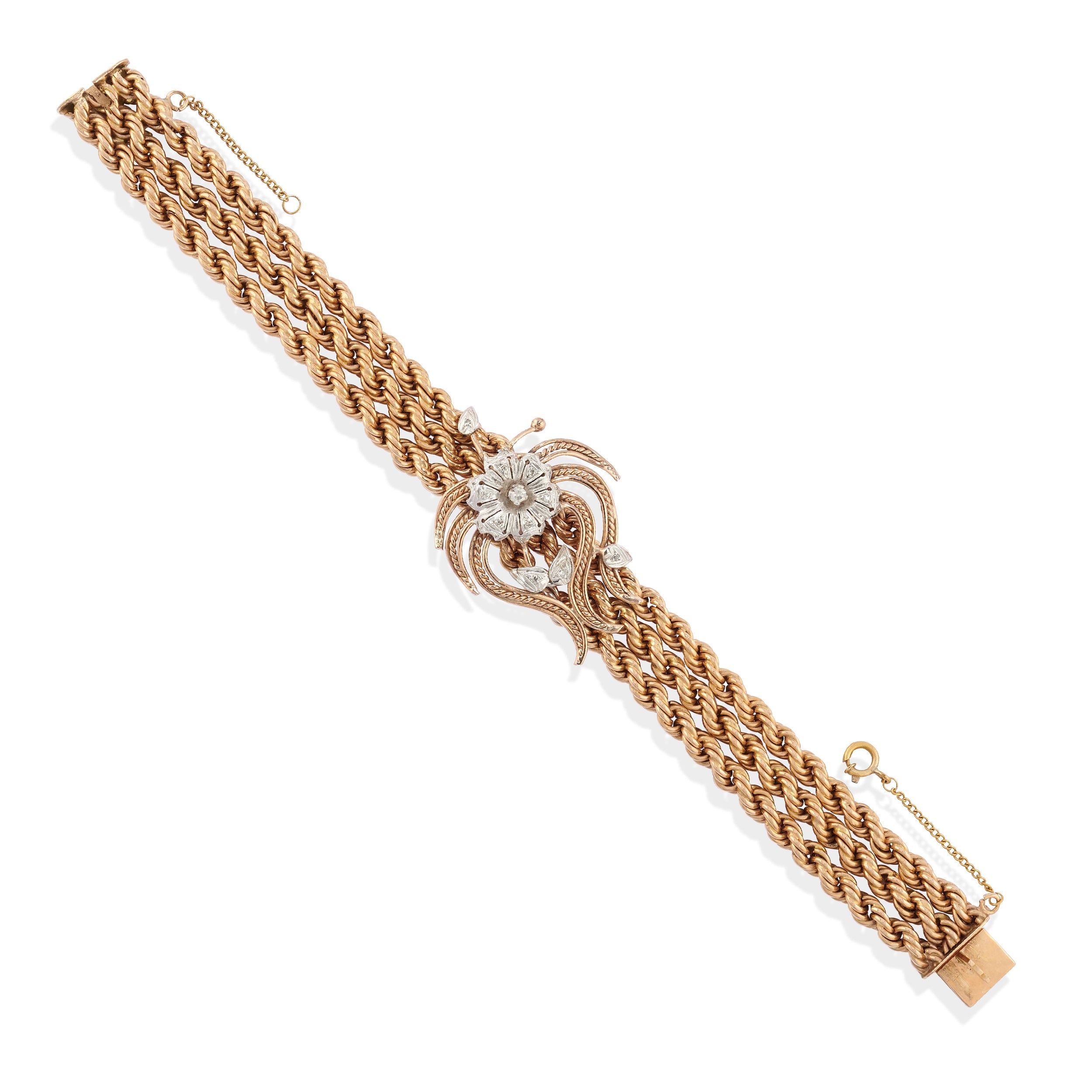 a tre catene torchon, con motivo centrale a fiore con diamanti taglio huit-huit.