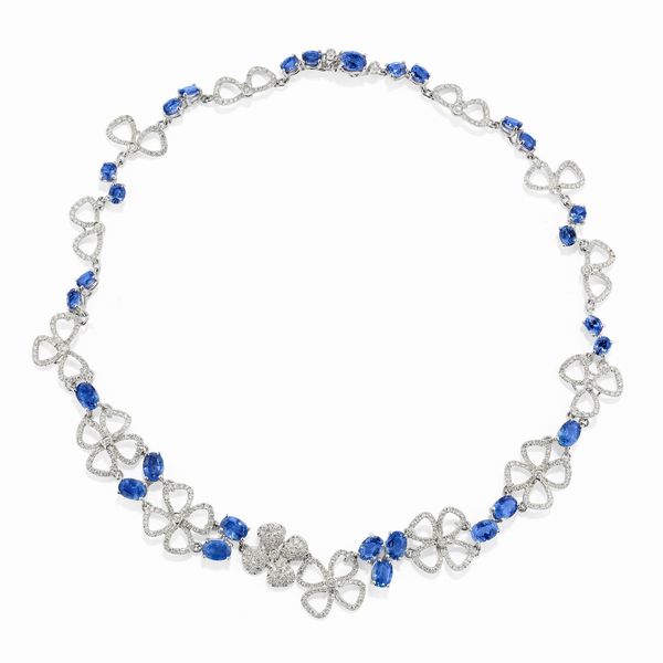 a girocollo, motivo floreale con zaffiri taglio ovale per totale ct 5,00 circa e diamanti taglio brillante.