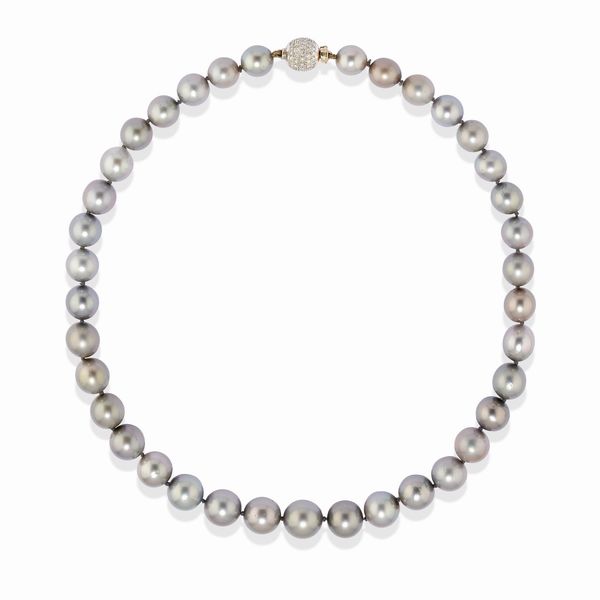 ad un filo di perle coltivate Tahiti a scalare di mm 14,00/11,50 circa, chiusura a boule in diamanti taglio brillante.