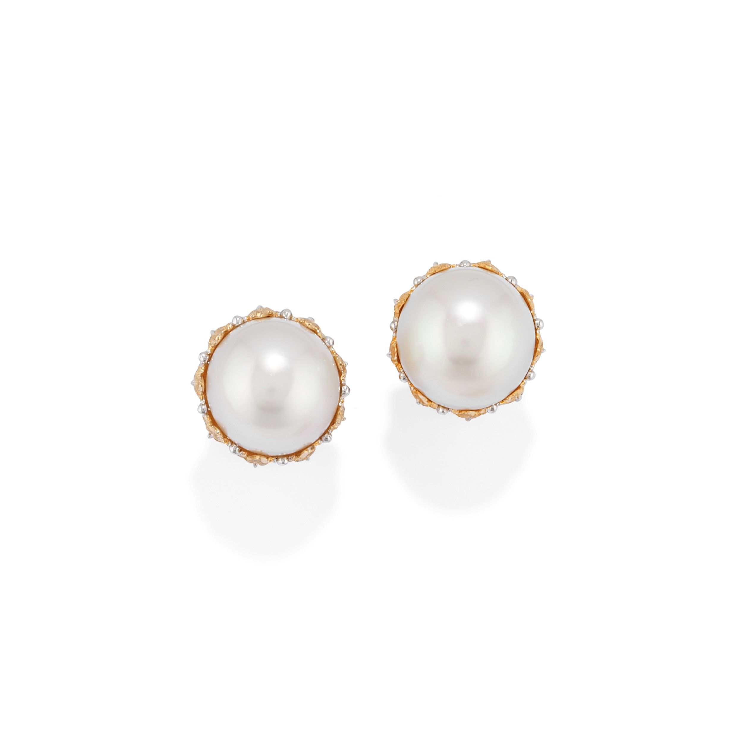 composta da collana ad un filo di perle coltivate South Sea di mm 13,00/11,00 circa con fermezza con foglie incise, e paio di orecchini con perle coltivate South Sea di mm 15,00 circa, decoro a foglie incise, chiusura perno e clip, gioielli firmati, punzonati e numerati.