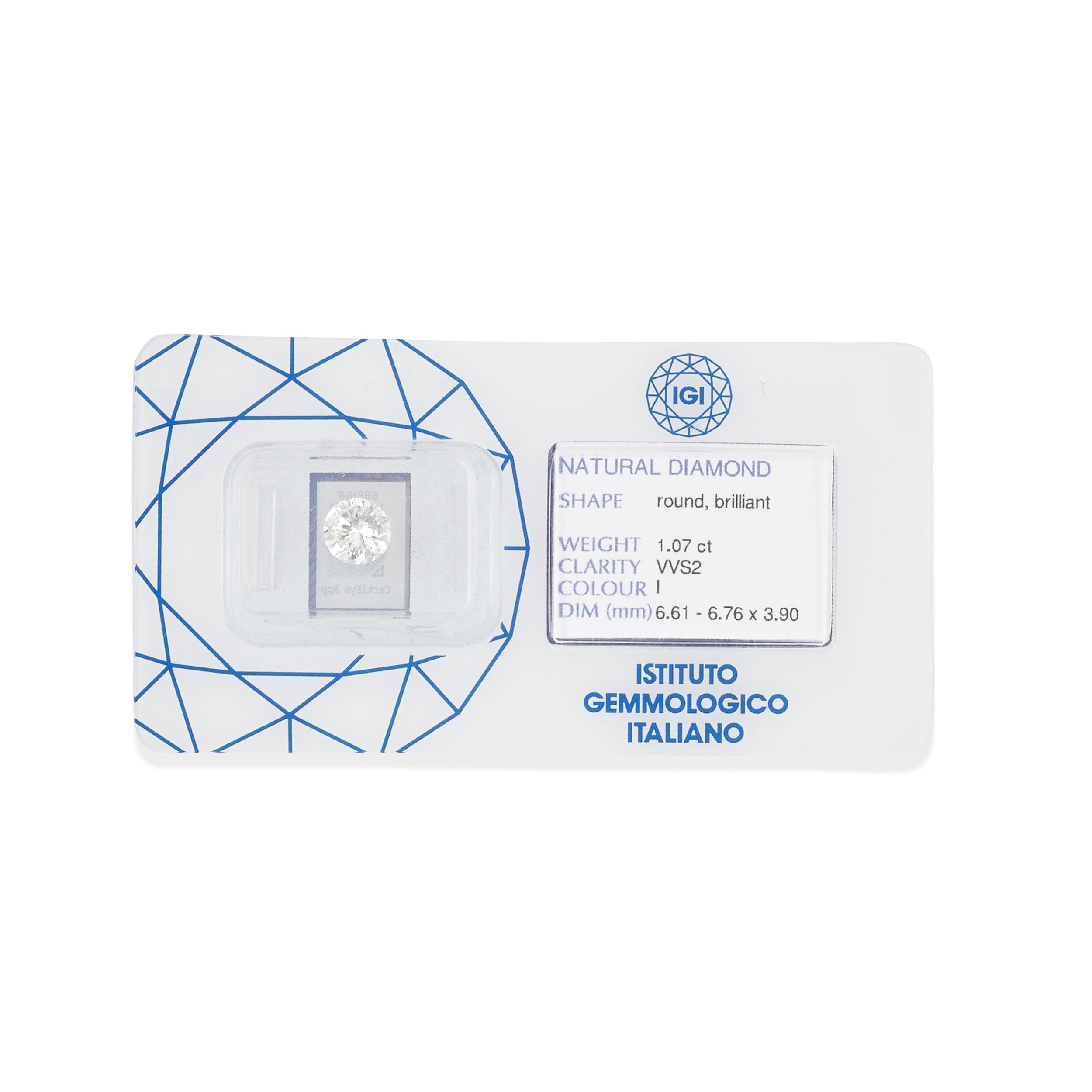 taglio brillante di ct 1,07, colore I e purezza VVS2, entro blister IGI.