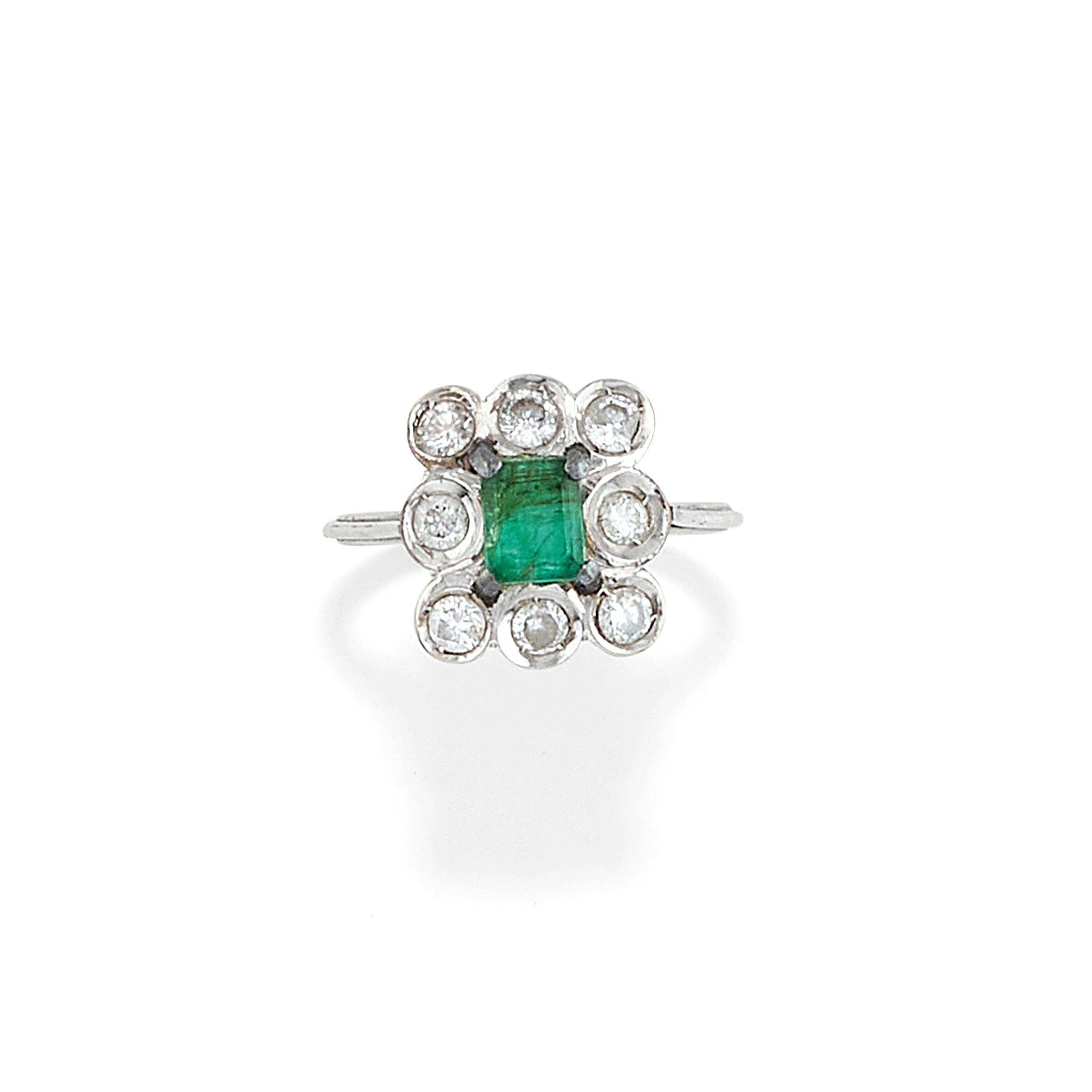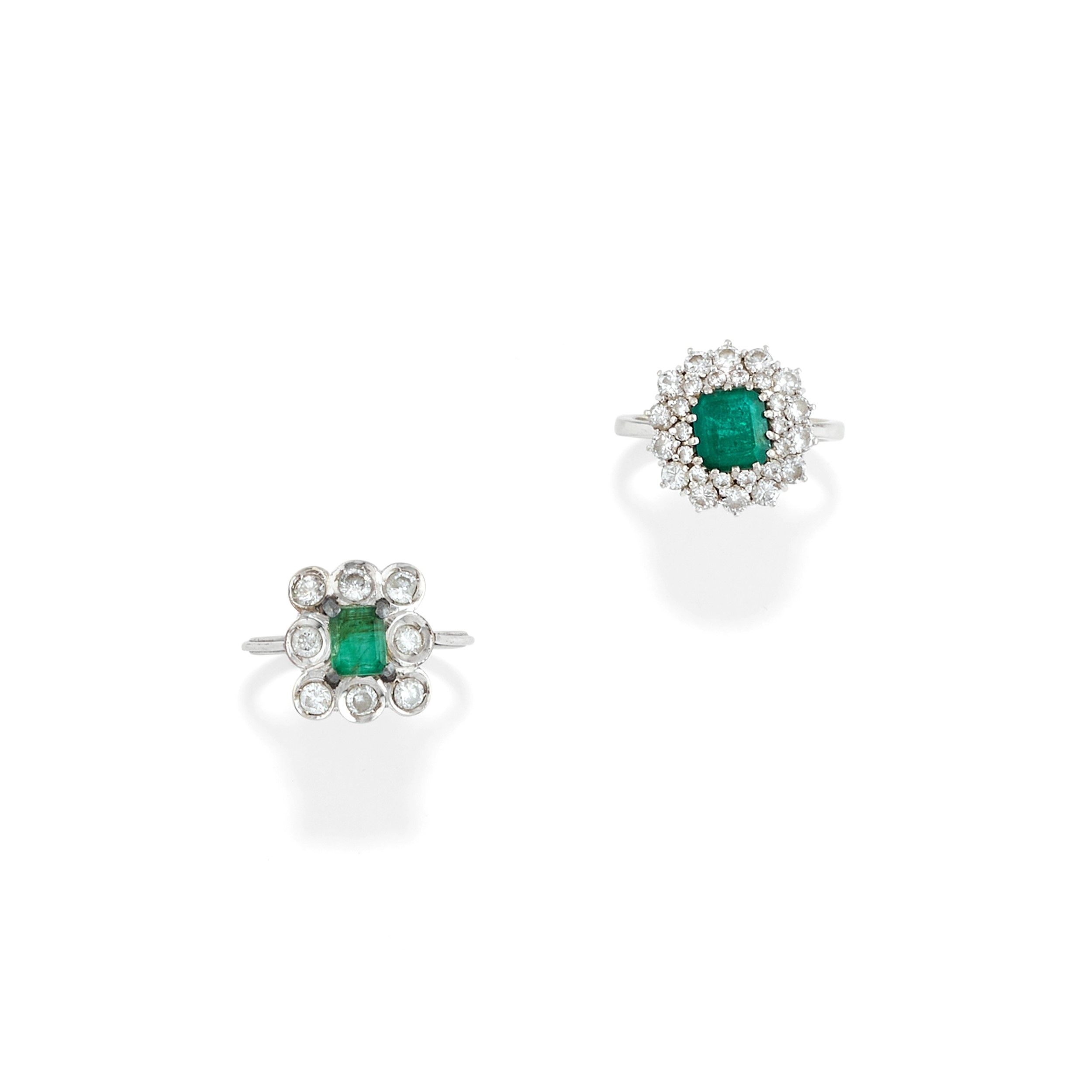 al centro smeraldi taglio rettangolare a contorno ottagonale per totale ct 1,40 circa entro cornici in diamanti taglio brillante per totale ct 1,20 circa.
