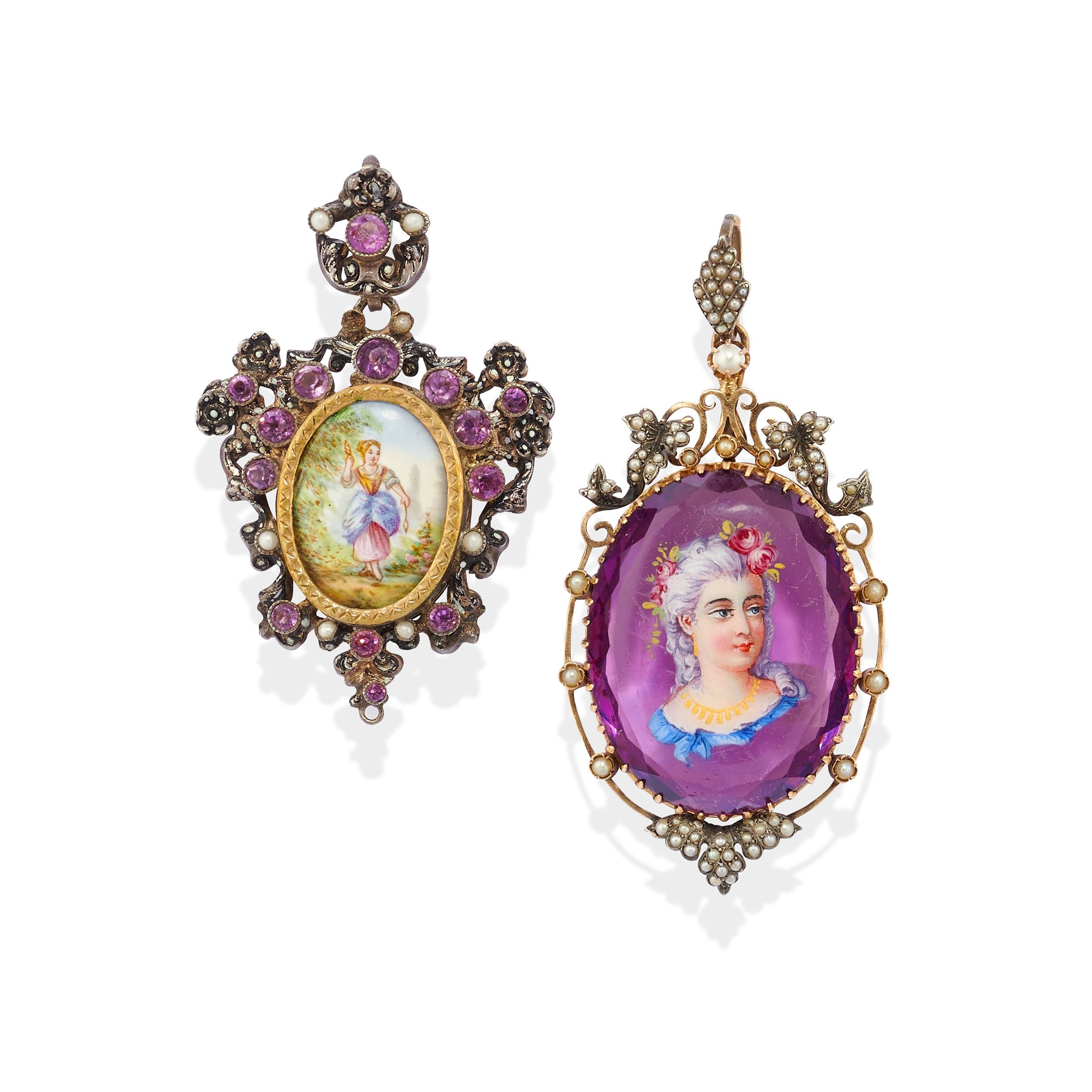 uno con figura femminile dipinta su pasta vitrea color viola, l'altro con con miniatura dipinta su medaglione apribile.