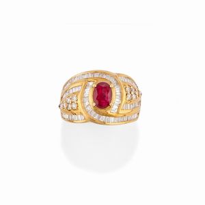in oro giallo 18k, Peso g 9,30 misura 15 al centro rubino taglio ovale di ct 0,60 circa, decorato con motivi a [..]
