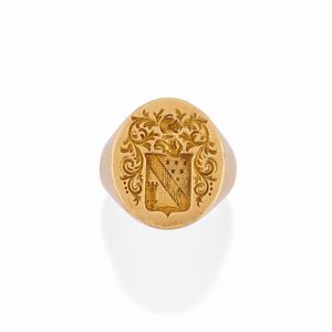 in oro giallo 18k, Peso g 38,80 misura 26 con stemma nobiliare inciso.