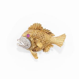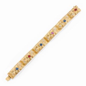 in oro giallo 18k, Peso g 14,00 cm 6,00 a tralcio di fiori con rubini, zaffiri e smeraldi taglio rotondo e diamanti [..]