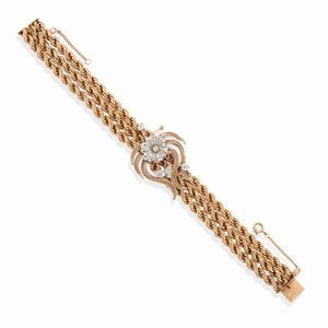 in oro rosso 18k, Peso g 33,20 cm 18,00 a tre catene torchon, con motivo centrale a fiore con diamanti taglio [..]