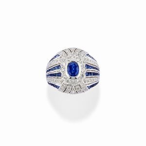 in oro bianco 18k, Peso g 10,40 misura 18,5 di forma bombata, al centro zaffiro taglio ovale, decori a milligrano [..]