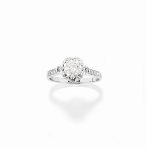in oro bianco 18k, Peso g 3,80 misura 11 al centro diamante taglio brillante di ct 0,80 circa, decorato da diamanti [..]