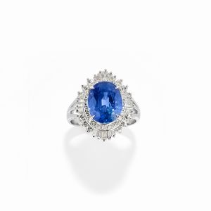in oro giallo 18k, Peso g 7,30 misura 15 al centro rubino di forma ovale di ct 1,45 circa e diamanti taglio brillante [..]