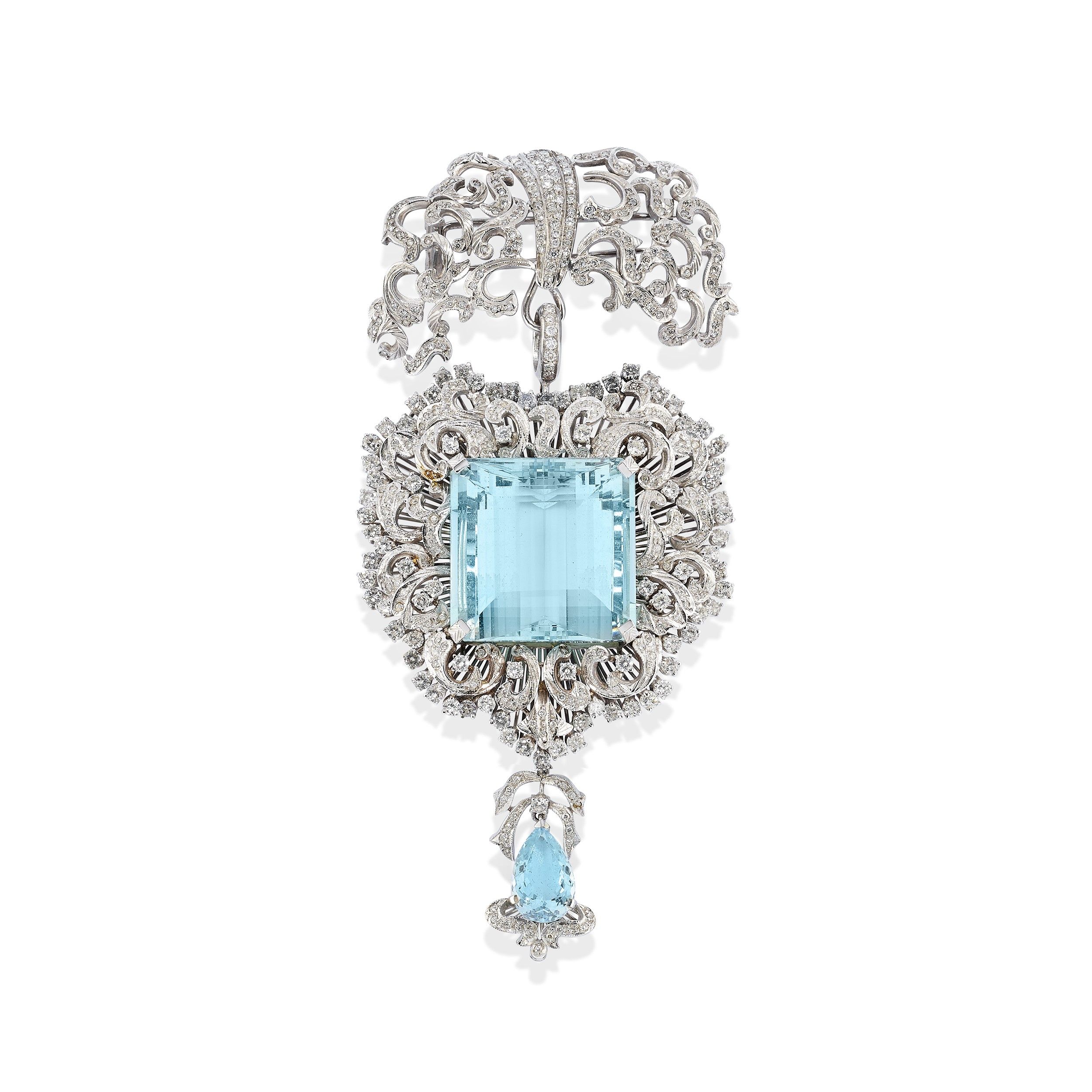 pendente amovibile trattenuto da parte superiore a spilla, decorato con motivo traforato e diamanti taglio brillante, al centro acquamarina di forma ottagonale taglio a gradini di ct 85,00 circa (mm 26,65x26,70), motivo pendente con acquamarina taglio goccia.