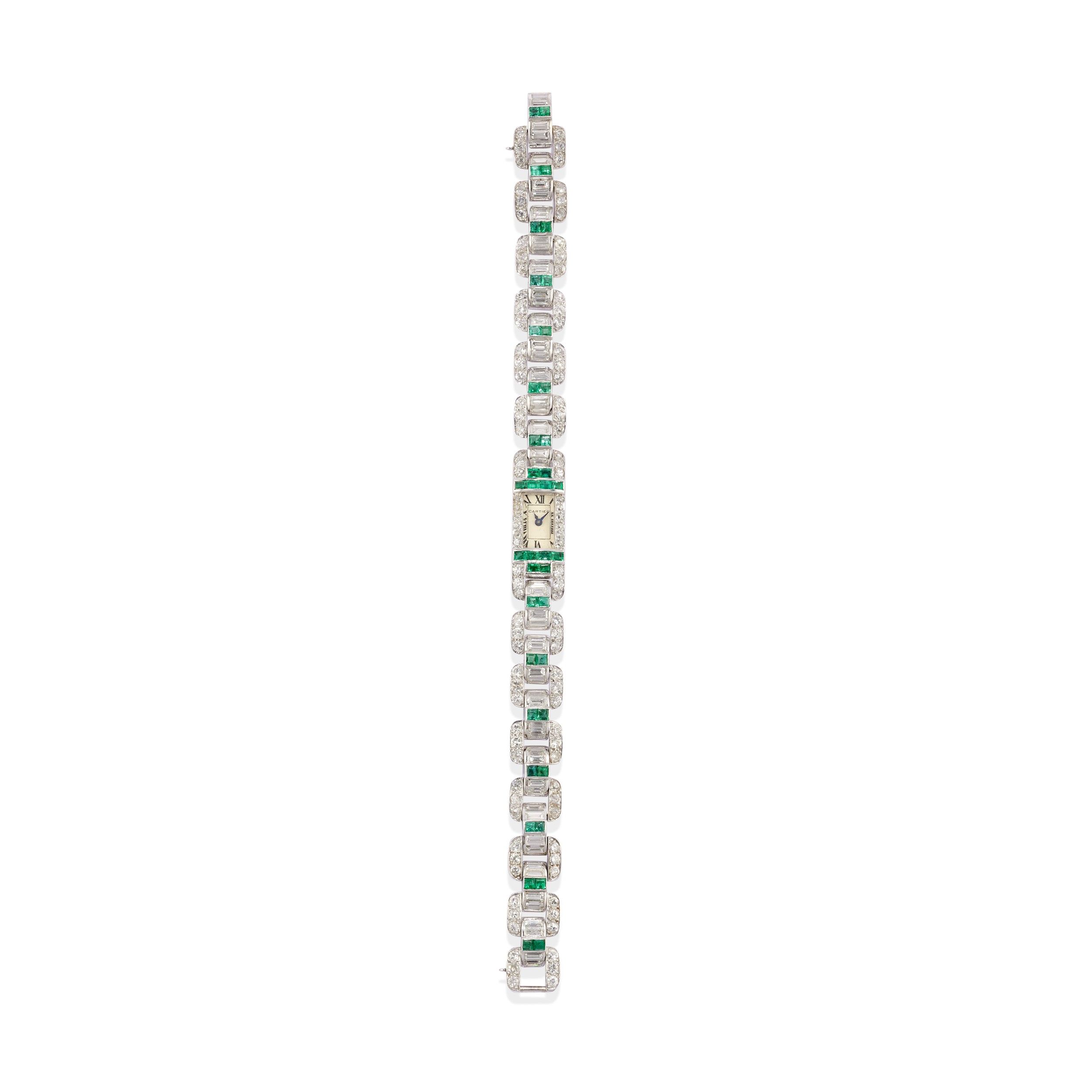anni '30 cassa rettangolare, quadrante champagne, numeri romani dipinti e movimento a carica manuale, bracciale integrato e interamente decorato da smeraldi taglio carrè per totale ct 2,00 circa e diamanti taglio brillante, vecchio e baguette per totale ct 7,00 circa, con astuccio, difetti (uno smeraldo leggermente sbeccato), da revisionare, reca firma Cartier al quadrante, movimento LeCoultre Co.