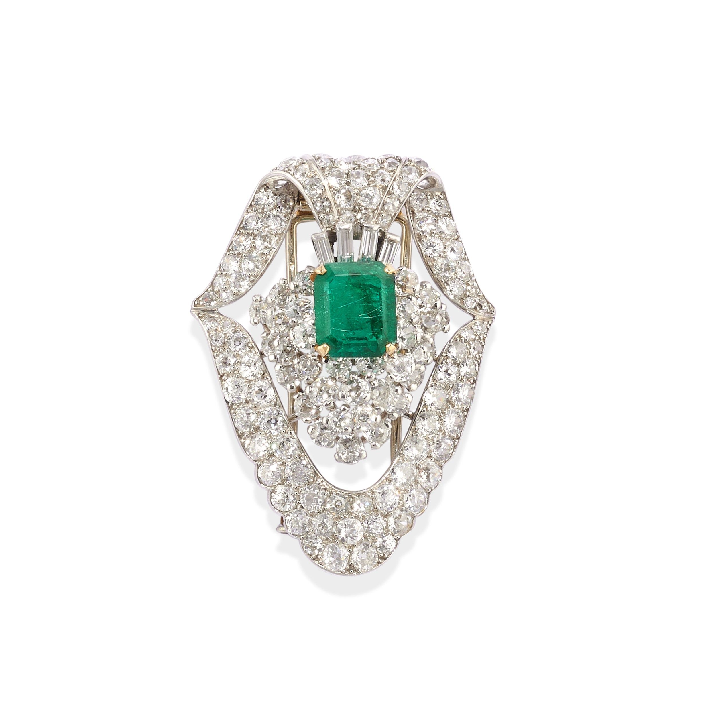 anni '30 di forma geometrica, al centro smeraldo Colombia di forma ottagonale di ct 4,00 circa, interamente decorata da diamanti taglio vecchio e baguette per totale ct 7,00 circa, reca firma Cartier Paris, con astuccio.