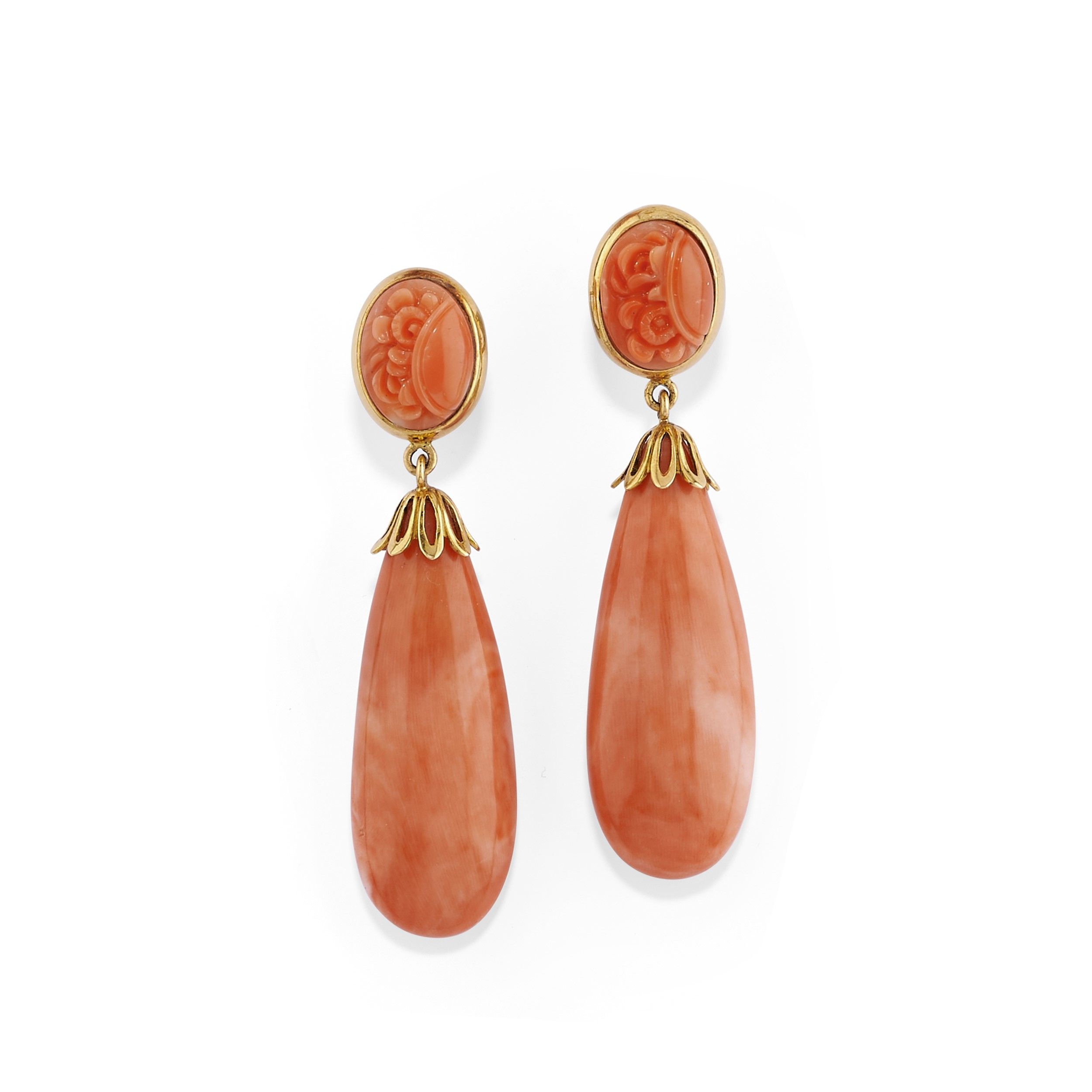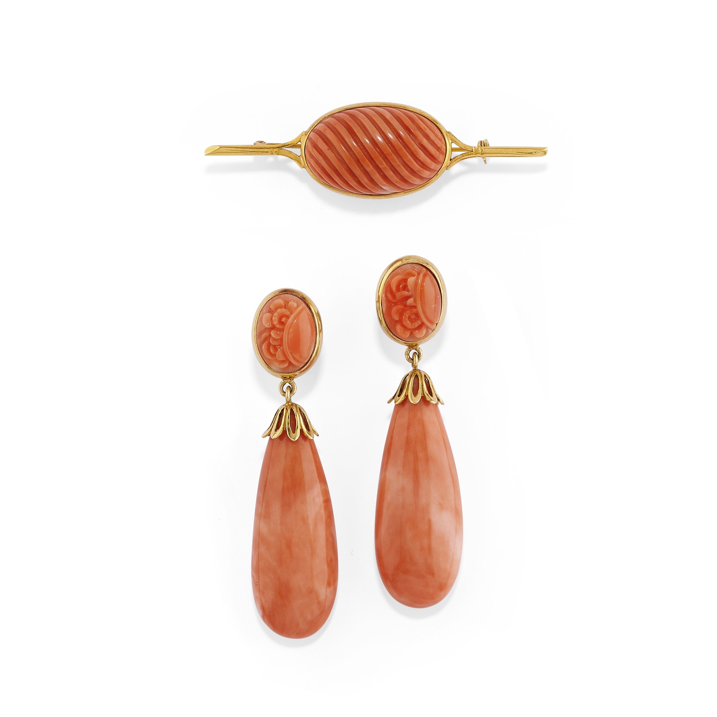 composto da coppia di orecchini in corallo giapponese con parte superiore taglio ovale incisa a fiori da cui dipartono due gocce di mm 10,04/16,69x44,00-9,11/16,28x43,50 circa, chiusura perno e clip e spilla con inserto ovale inciso in corallo giapponese di mm 26,60x16,70x7,98 circa.