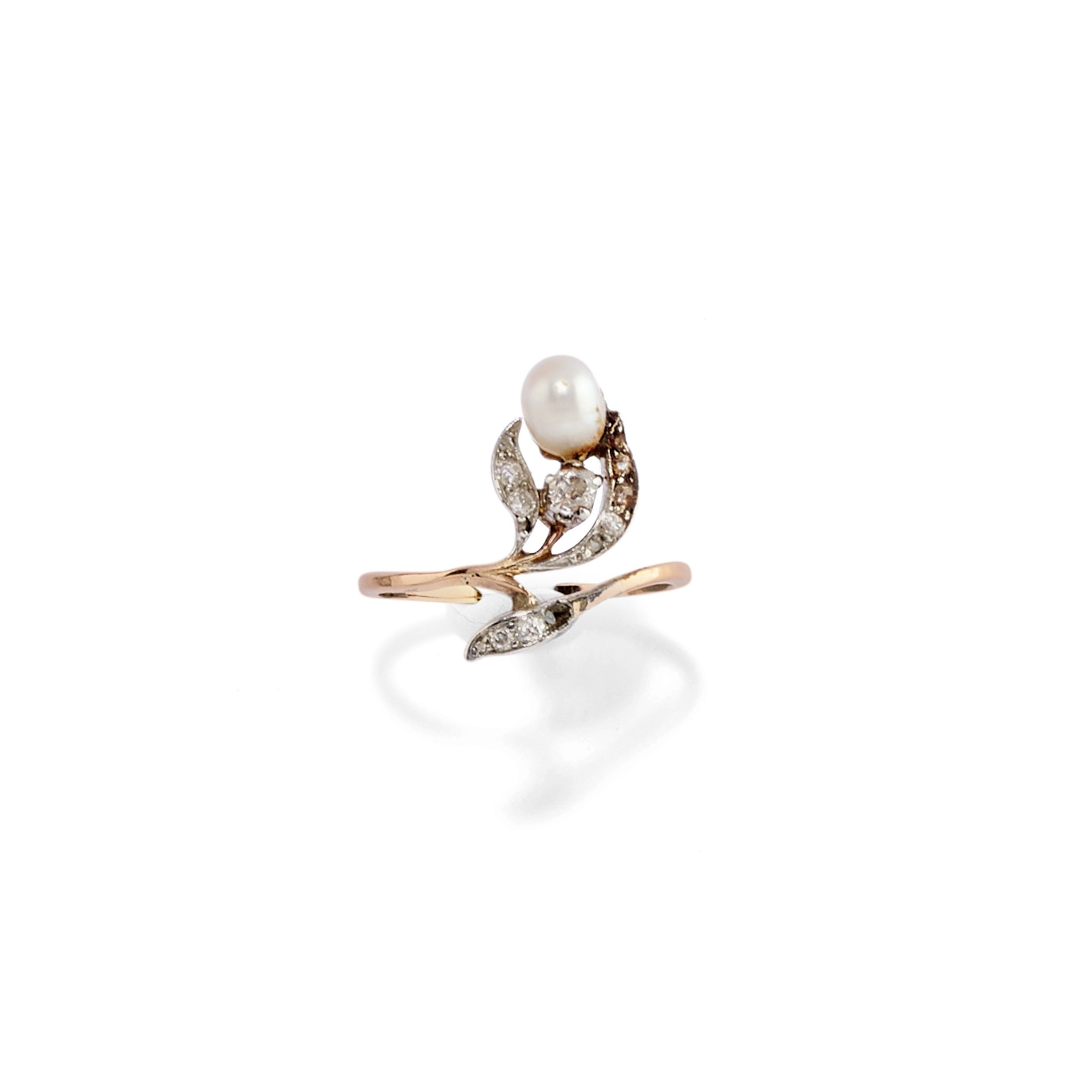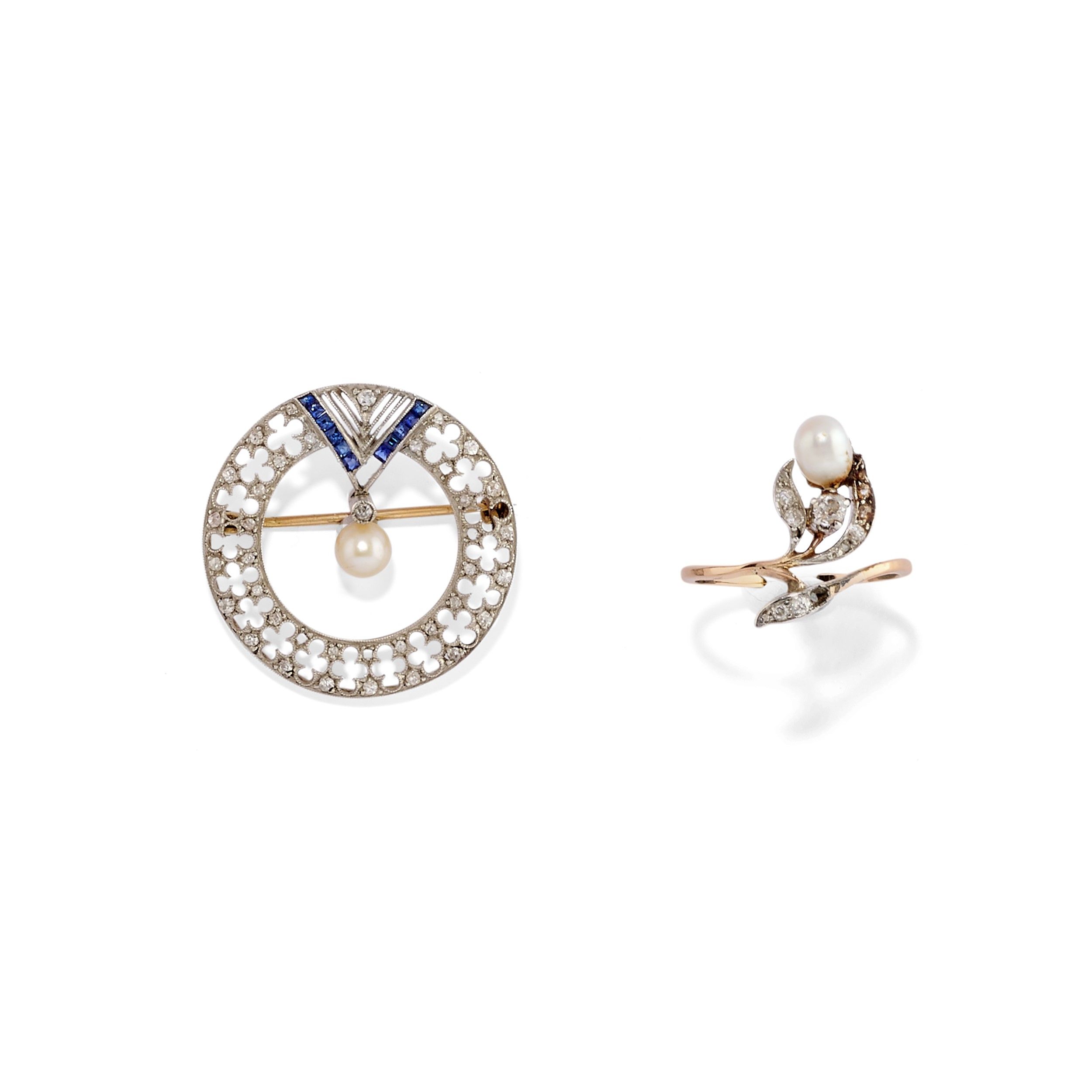 composto da anello e spilla impreziositi da piccoli diamanti taglio vecchio, perle (prob. naturali) e zaffiri, difetti (zaffiri e un diamante mancante).